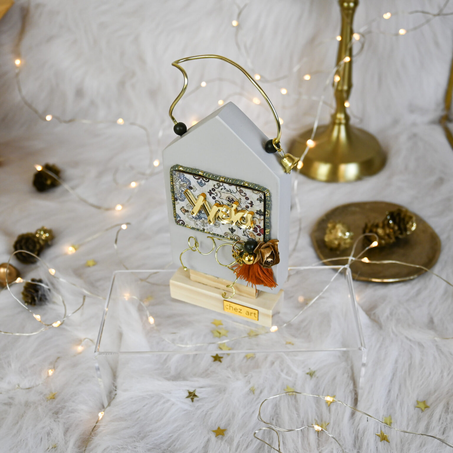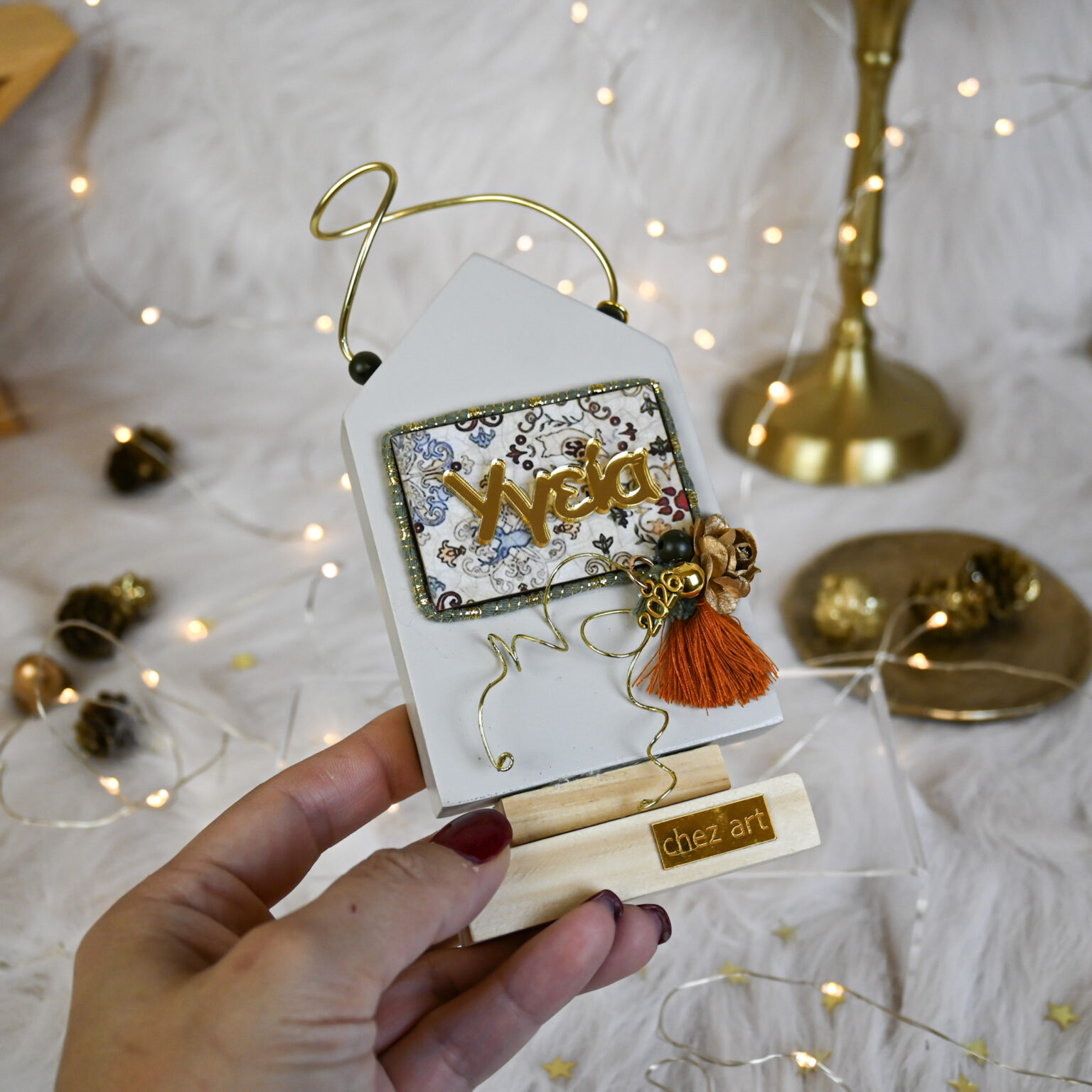 Υλικά: Ξύλινο μασίφ σπιτάκι σε εκρού χρώμα, πάνω σε ξύλινη βάση με επίπεδα φυσικής απόχρωσης. Η μπροστινή του πλευρά διακοσμείται με παραλληλόγραμμο στοιχείο με print, εκκρεμές χρυσό μεταλλικό μοτίφ ’26, τεχνητά λουλούδια, πορτοκαλί διακοσμητική φούντα, πράσινο-χρυσό κορδόνι, μεταλλικό διακοσμητικό συρματάκι, πολυεστερικές και ξύλινες χάντρες υψηλής ποιότητας. Στην οροφή του έχει μεταλλικό διακοσμητικό συρματάκι και διακοσμητικό στοιχείο καμπάνα.