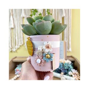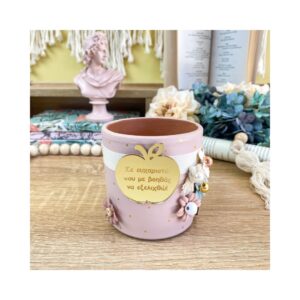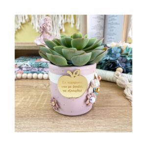 Κεραμικό κασπώ σε απόχρωση ροζ πούδρας, διακοσμημένο με κορδέλα σε φυσική απόχρωση και plexiglass gold στοιχείο σε σχήμα μήλου με ιδιαίτερο μήνυμα, ξύλινη επιγραφή “για τη δασκάλα μου” και υψηλής ποιότητας στοιχεία.