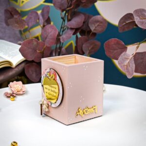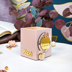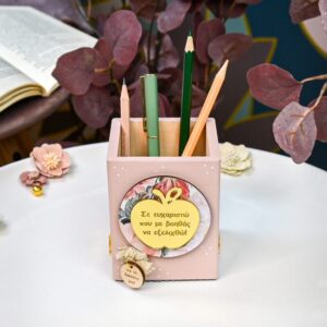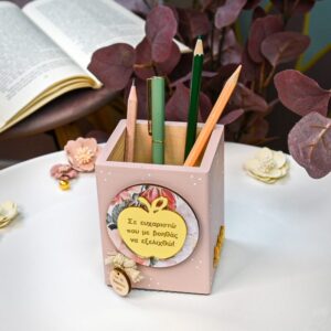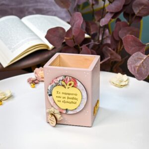Υλικά: Ξύλινη τετράγωνη μολυβοθήκη σε απόχρωση ροζ πούδρα, με λευκές λεπτομέρειες. Διακοσμείται με ξύλινο στρογγυλό επίπεδο με floral print και plexiglass gold στοιχείο σε σχήμα μήλο με χάραξη “Σε ευχαριστώ που με βοηθάς να εξελιχθώ!” , φυσικό κορδόνι, εκκρεμές στρογγυλό ξύλινο στοιχείο με χάραξη “για τη δασκάλα μου!”, ενώ περιμετρικά στολίζεται με plexiglass gold ευχές “αγάπη, χαρά”. Η βάση της καλύπτεται εξωτερικά με υφή δερματίνης pvc.
