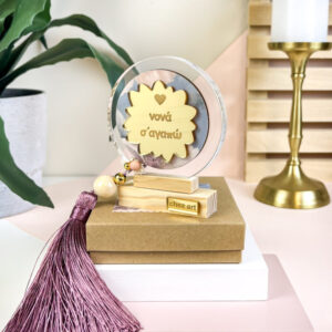 Υλικά: Plexiglass διάφανη στρογγυλή πλακέτα, πάνω σε ξύλινη βάση φυσικής απόχρωσης. Διακοσμείται με ξύλινο στρογγυλό επίπεδο με print, plexiglass gold στοιχείο με χάραξη “νονά σ’ αγαπώ” και καρδούλα, φυσικά κορδόνια, πολυεστερικές και ξύλινες χάντρες και πλούσια φούντα υψηλής ποιότητας σε απόχρωση σάπιο μήλο.