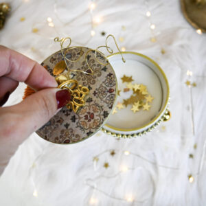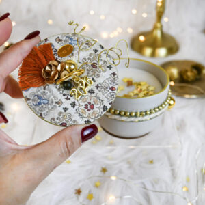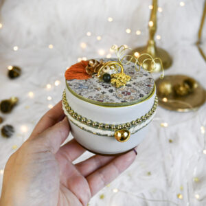 Υλικά: Κεραμικό κηροπήγιο σε απόχρωση εκρού με χειροποίητο αρωματικό κερί, πάνω σε λεπτή ξύλινη βάση φυσικής απόχρωσης. Στολίζεται με πράσινο – χρυσό κορδόνι και χρυσή πολυεστερική τρέσα περιμετρικά, φυσικό κορδόνι και πολυεστερικές και ξύλινες χάντρες υψηλής ποιότητας. Το καπάκι του είναι από ξύλο με print ντυμένο και με τεχνητά λουλούδια, πολυεστερικές και ξύλινες χάντρες υψηλής ποιότητας, χρυσό μεταλλικό συρματάκι, πορτοκαλί φουντίτσα και εκκρεμές χρυσό μεταλλικό μοτίφ ’2026.