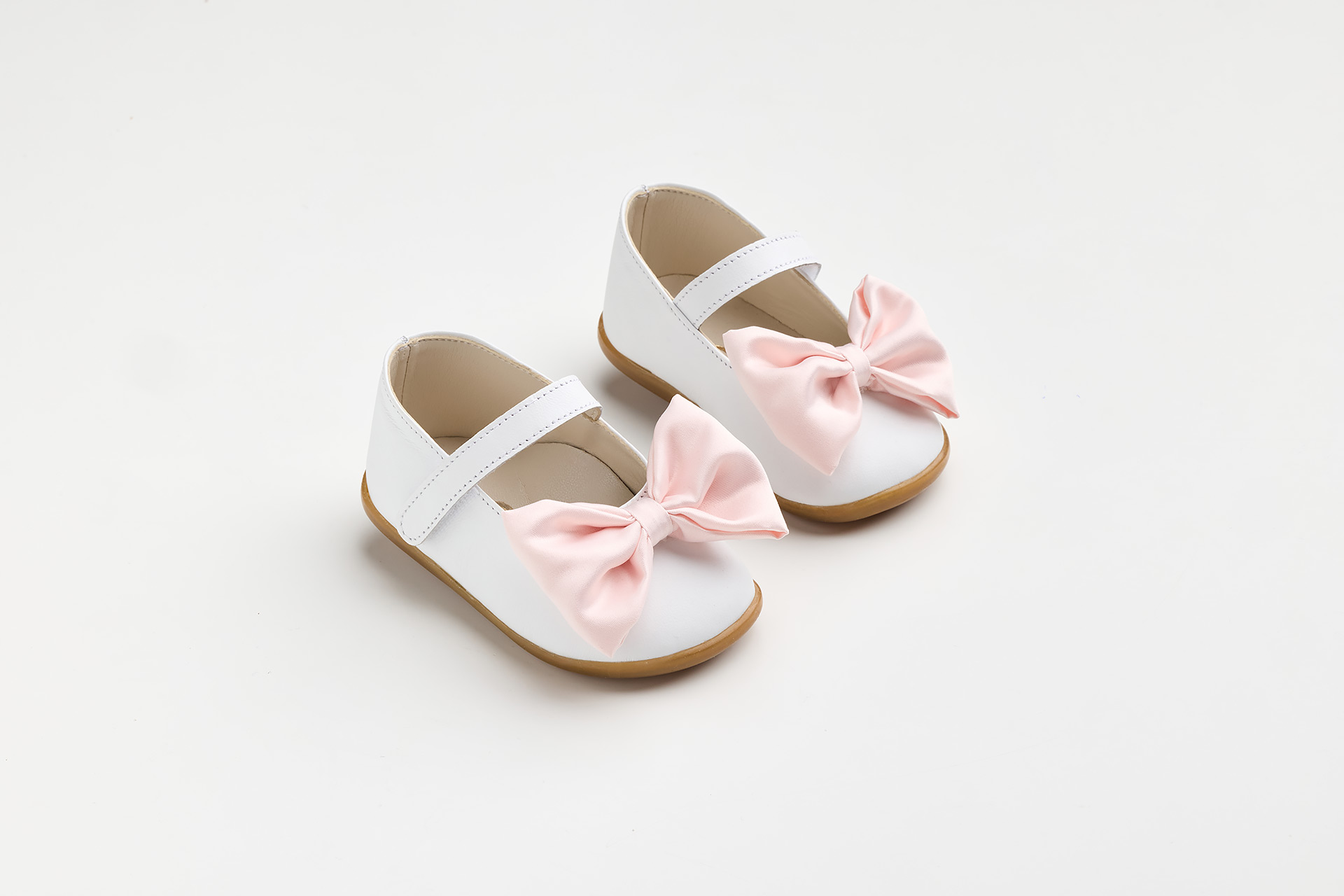 Μπαλαρίνα για τα πρώτα βήματα σε λευκό τεχνόδερμα με ροζ σατέν χειροποίητο φιόγκο. Ονειρικό και εντυπωσιακό παπουτσάκι για τις μικρές μας κυρίες που κάνουν τα πρώτα τους βήματα