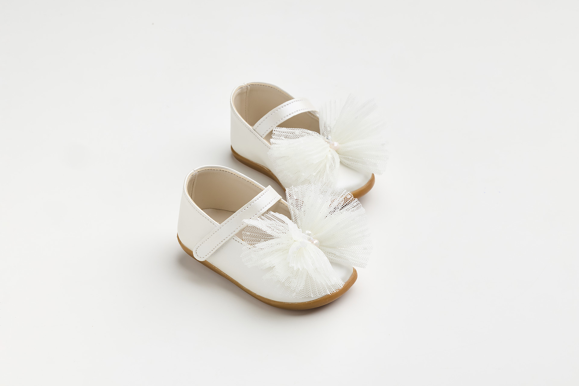 Μπαλαρίνα για τα πρώτα βήματα σε εκρού τεχνόδερμα με χειροποίητο φιόγκο από εκρού πουά πλισέ τούλι.Ένα στυλάτο και μοντέρνο παπούτσι. Για γονείς και νονούς που θέλουν κάτι μοδάτο για κάθε περίσταση