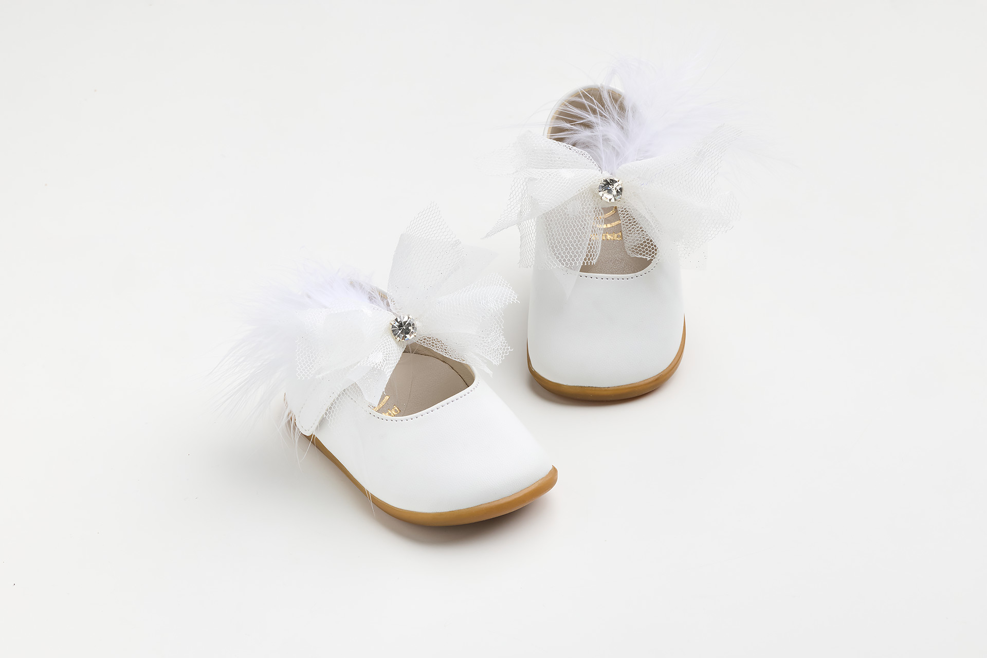 Μπαλαρίνα για τα πρώτα βήματα σε λευκό τεχνόδερμα με χειροποίητο διακοσμητικό από γκλιτερ και πουά τούλι στρας και φτερά. Κομψή και εντυπωσιακή μπαλαρίνα για τις καλαίσθητες φίλες μας