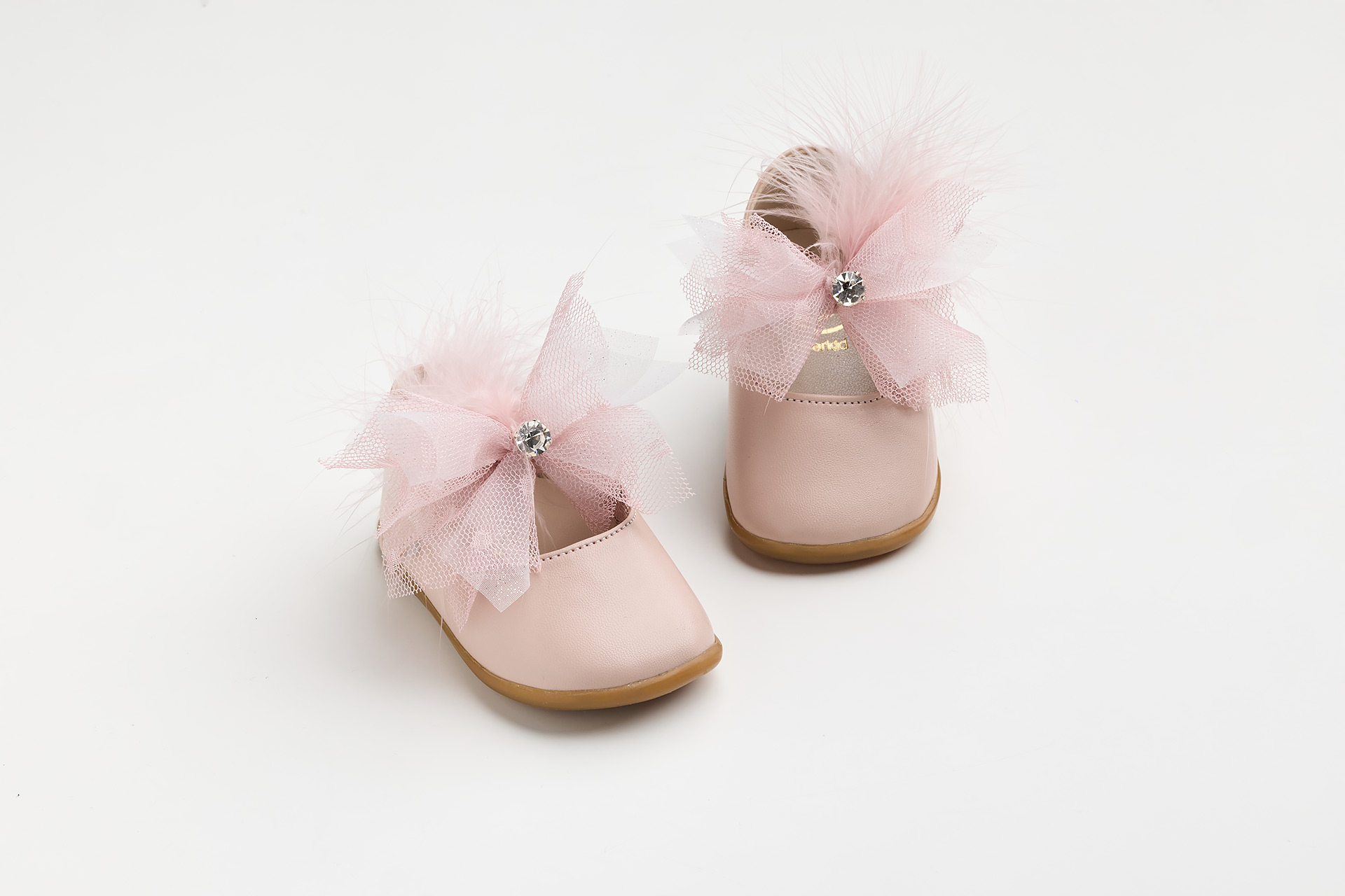 Μπαλαρίνα για τα πρώτα βήματα σε ροζ τεχνόδερμα με χειροποίητο διακοσμητικό από γκλιτερ και ροζ πουά τούλι στρας και φτερά.Κομψή και εντυπωσιακή μπαλαρίνα για τις καλαίσθητες φίλες μας