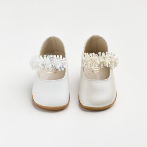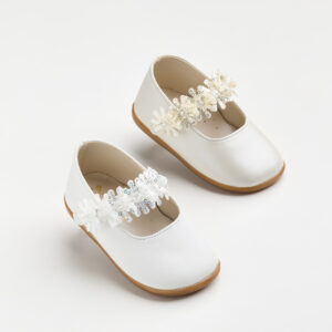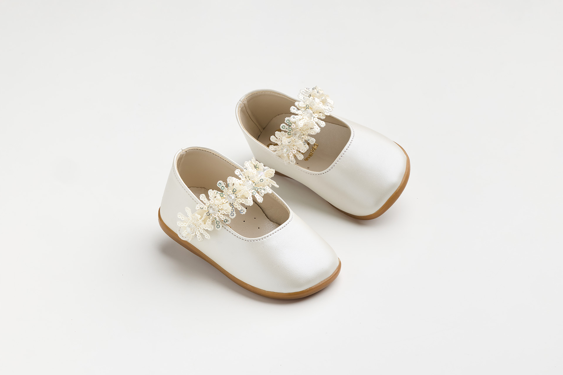 Μπαλαρίνα για τα πρώτα βήματα σε εκρού τεχνόδερμα με δαντελένια τρέσσα με παγιέτες. Μια κλασσική μπαλαρίνα με διακριτικό στολισμό. Για γονείς και νονούς που θέλουν κάτι elegant