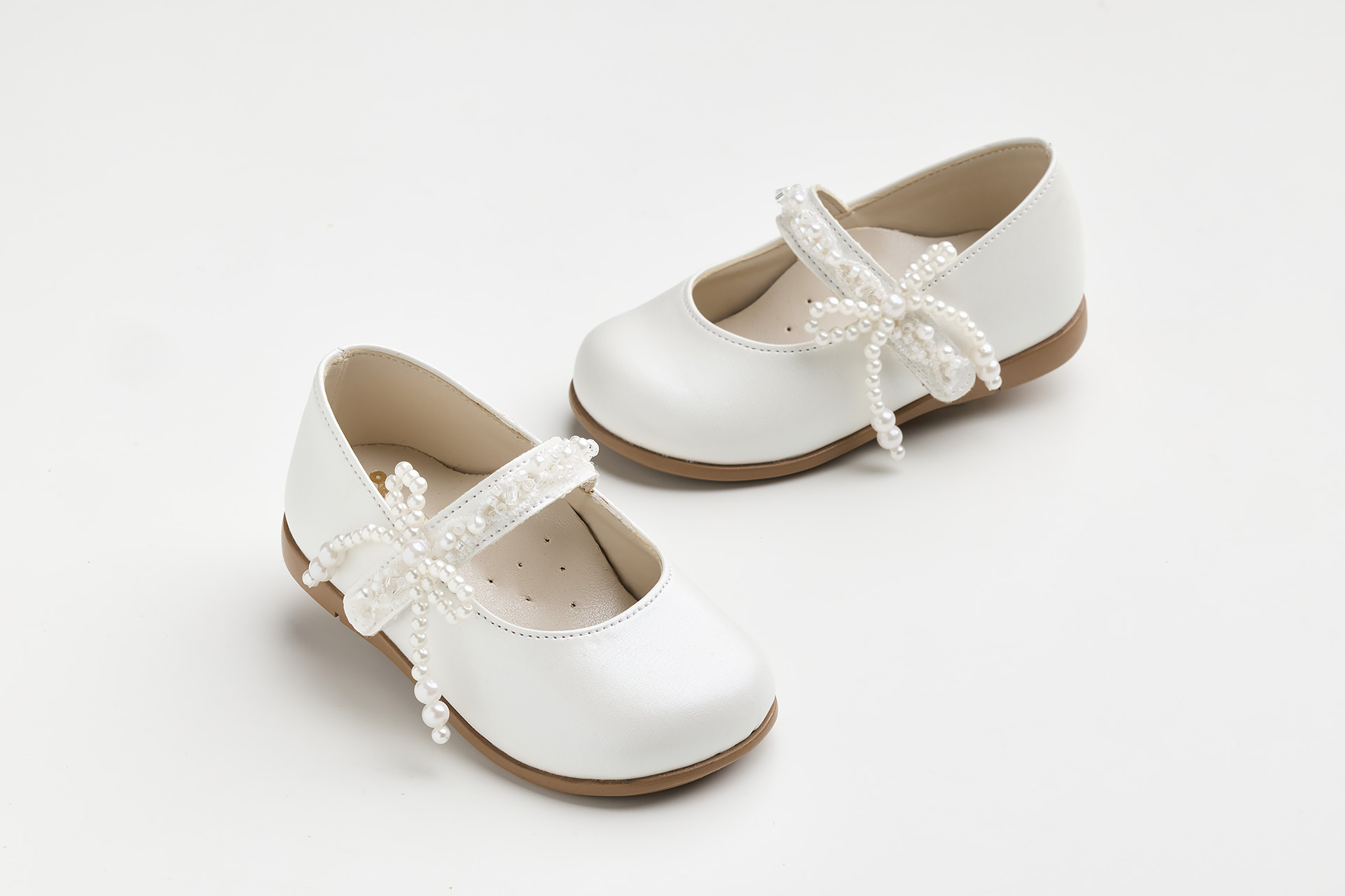 Μπαλαρίνα περπατήματος σε εκρού δέρμα διακοσμημένο με πέρλες. Φιογκάκι με πέρλες, η απόλυτη τάση. Μια επιλογή για γονείς και νονούς που αγαπούν την φινέτσα