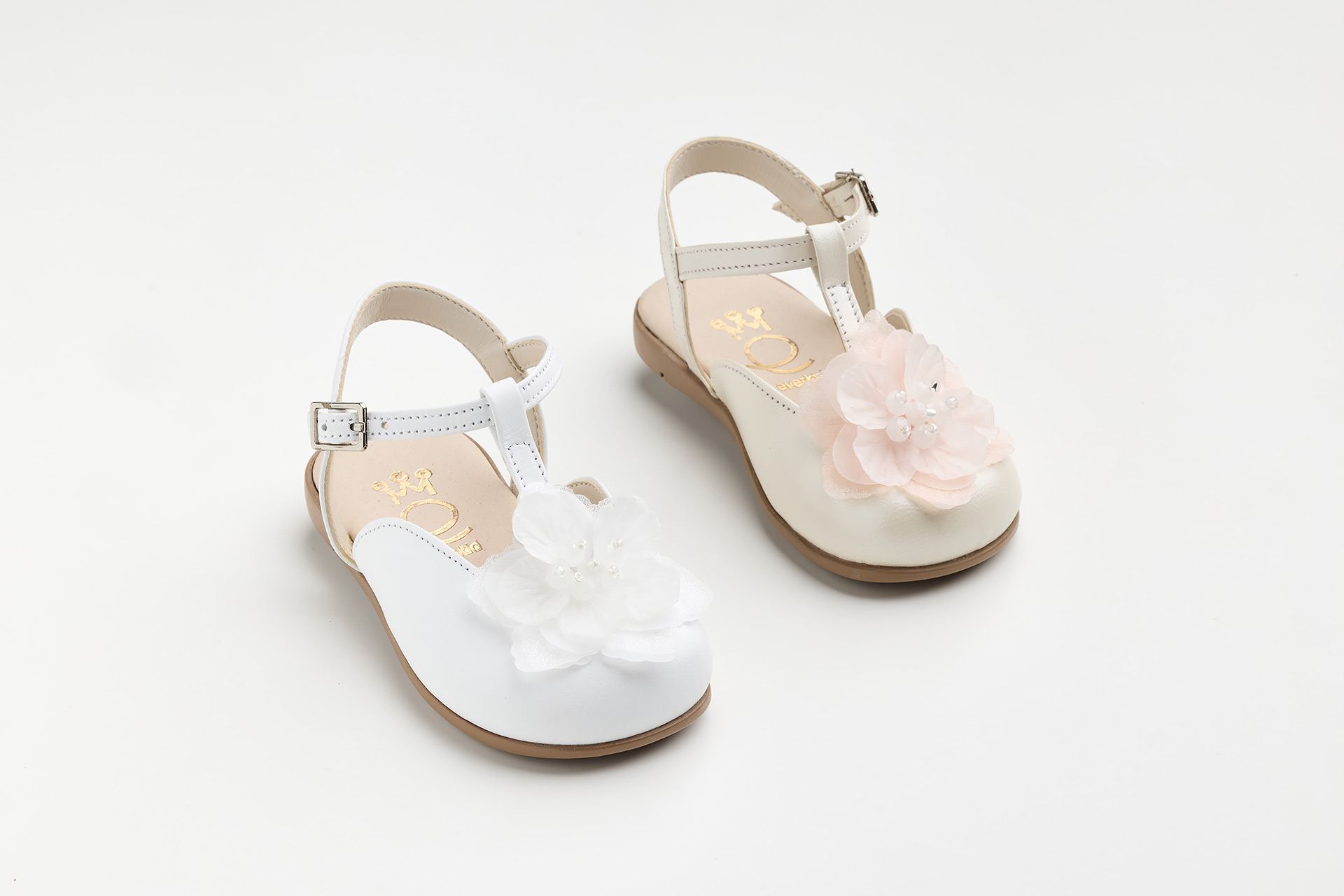 Μπαλαρίνα περπατήματος mule σε εκρού/λευκό δέρμα με ροζ λουλούδι. Κλασικό και κομψό παπουτσάκι με υπέροχο στολισμό. Για γονείς και νονούς που θέλουν κάτι διαχρονικό