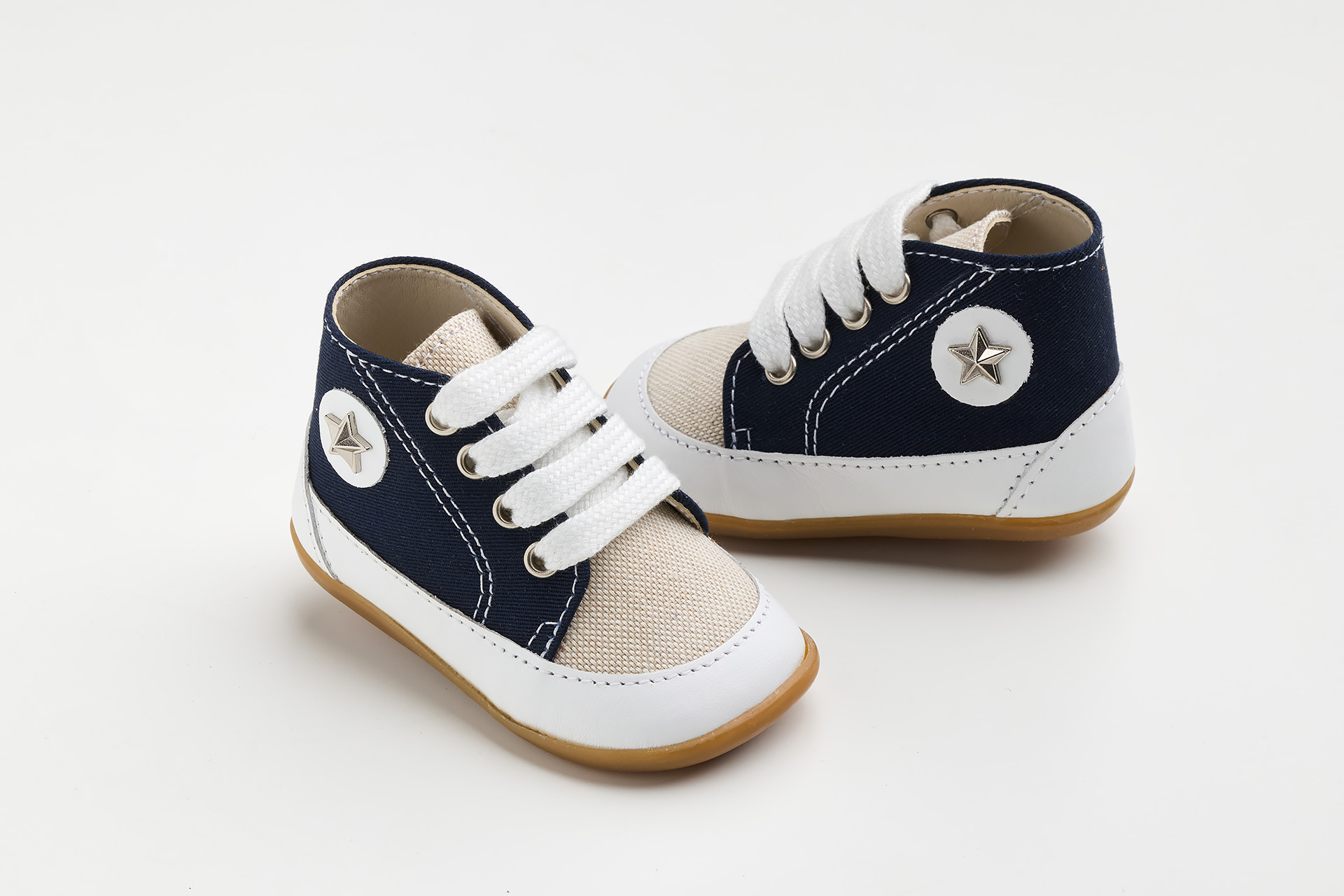 Μποτάκι πρώτα βήματα σε λευκό δέρμα, μπλέ και εκρού ύφασμα Ιδανικό για τους μικρούς μας φίλους που ξεκινάνε να κάνουνε τα πρώτα τους βήματα και θέλουν ένα μοντέρνο σύνολο για την ημέρα της βάπτισης αλλά και για πολλές άλλες εμφανίσεις