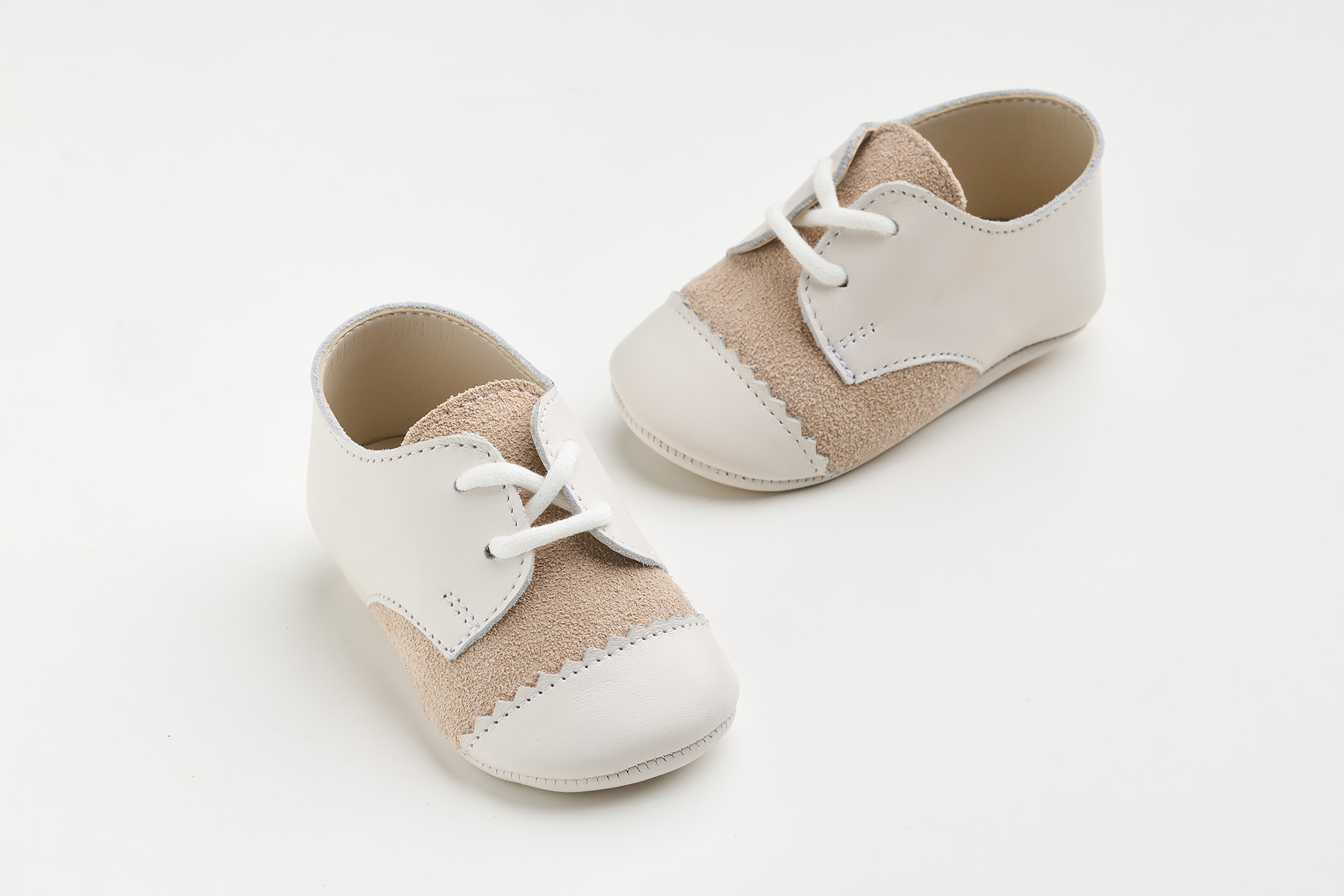 Παπουτσάκι αγκαλιάς σε εκρού λείο δέρμα και μπεζ καστόρ δέρμα. Ιδανικό για τους μικρούς μας φίλους που δεν περπατάνε ακόμα και θέλουν ένα στυλάτο σύνολο για τις πρώτες τους βόλτες.