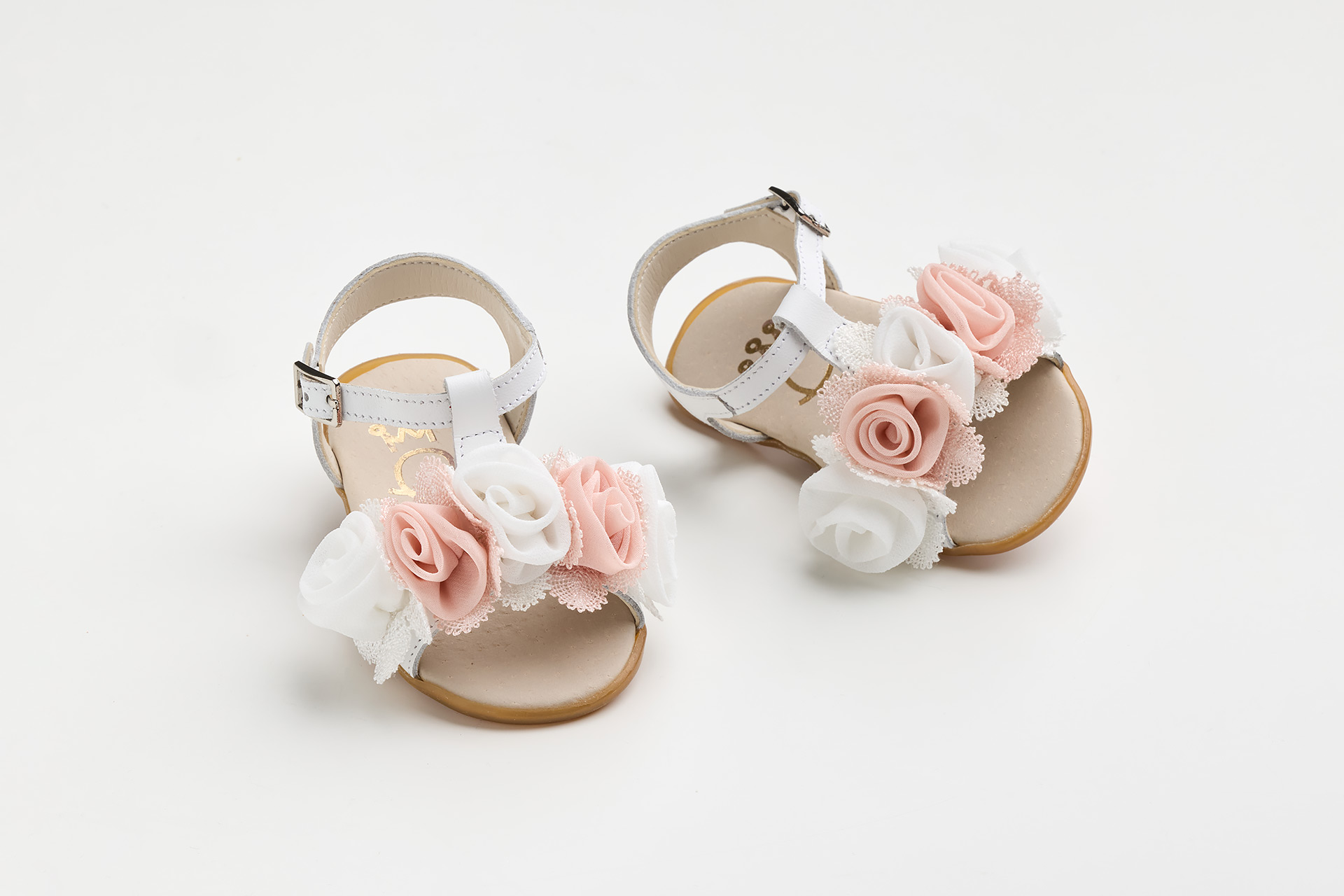 Σανδάλι για τα πρώτα βήματα σε λευκό δέρμα και λουλούδια σε off white και