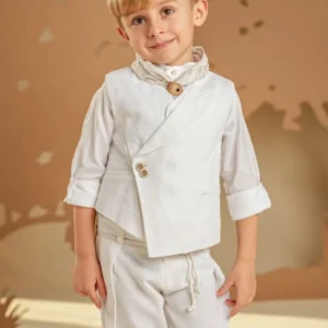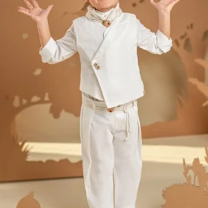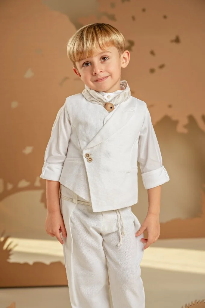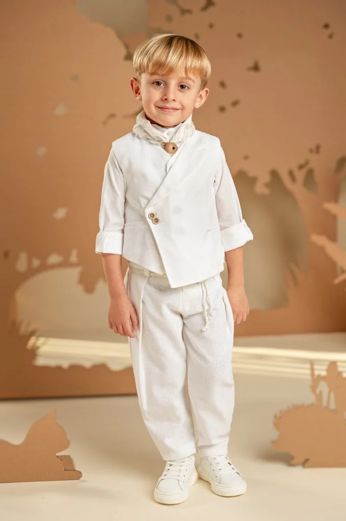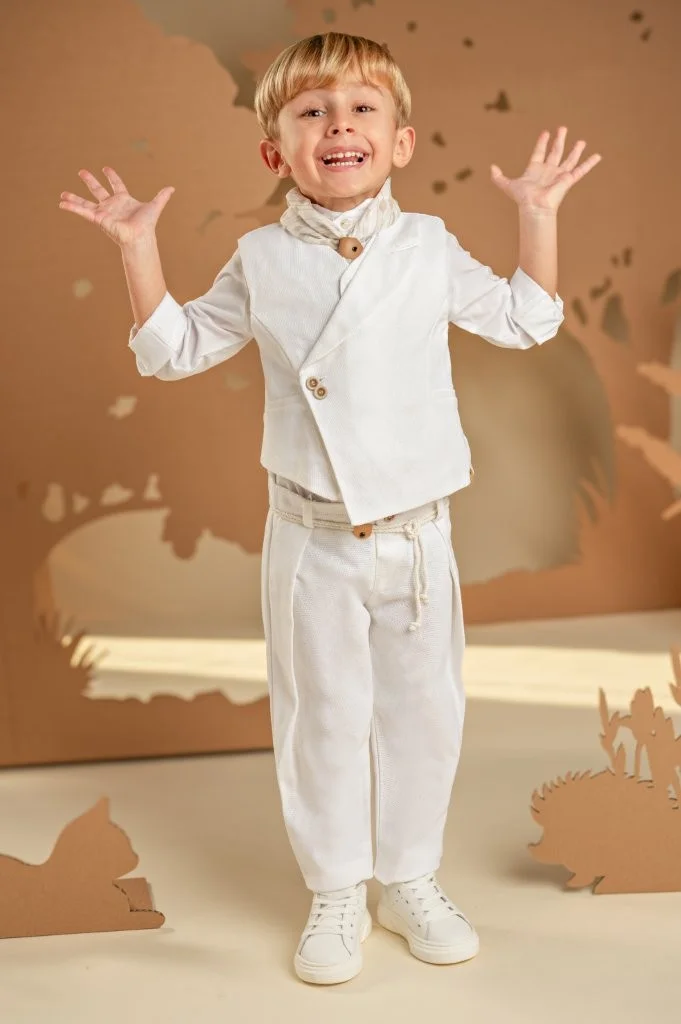 Ένα σετ ιδανικό για τους μικρούς κυρίους με ξεχωριστό γούστο και σύγχρονο στυλ. Το baggy παντελόνι με ιδιαίτερες reverse πιέτες και ζώνη από κορδονέτο, σε συνδυασμό με το σταυρωτό γιλέκο με λοξό κούμπωμα και μονό πέτο, και τα δύο από βαμβακερό ύφασμα σε off white απόχρωση, δημιουργούν ένα μοναδικό αποτέλεσμα. Το βαμβακερό πουκάμισο με ιδιαιτερο Mao γιακά και το exclusive εμπριμέ φουλάρι Baby Bloom σε λευκή-μπεζ απόχρωση ολοκληρώνουν το look. Για την τελευταία πινελιά, επιλέξτε ανάμεσα σε ψάθινο καπέλο ή υφασμάτινη τραγιάσκα, ανάλογα με το προσωπικό σας στιλ.