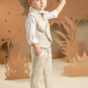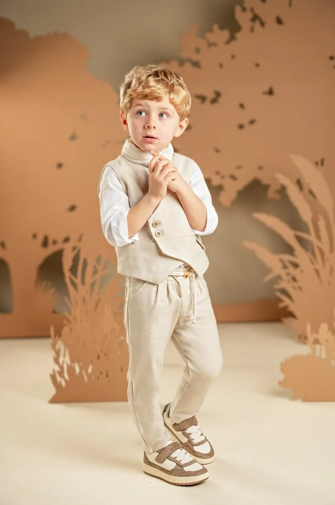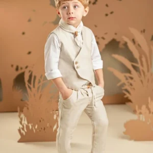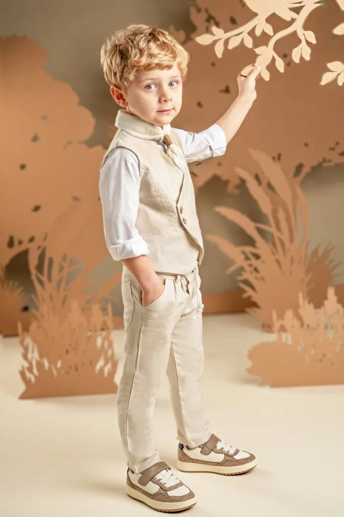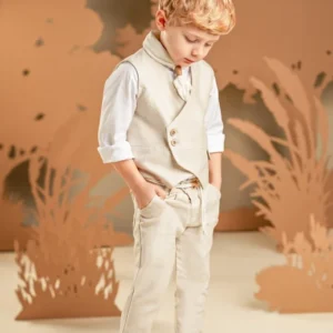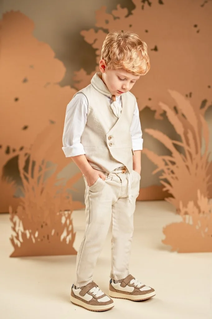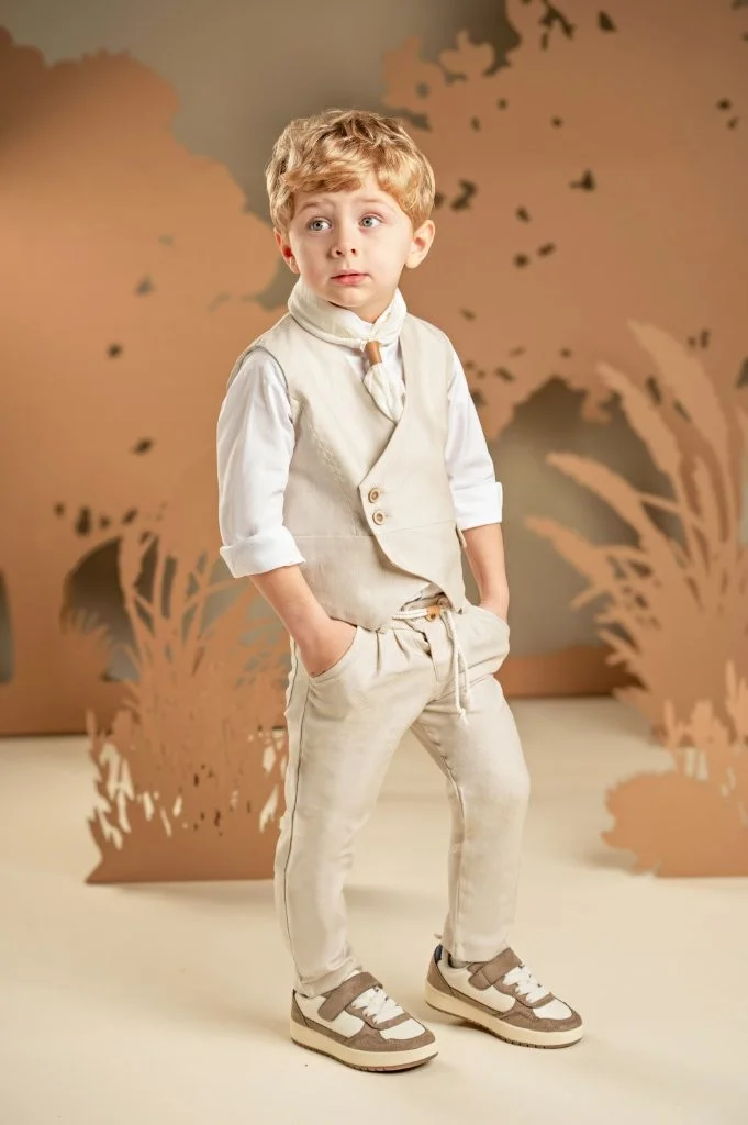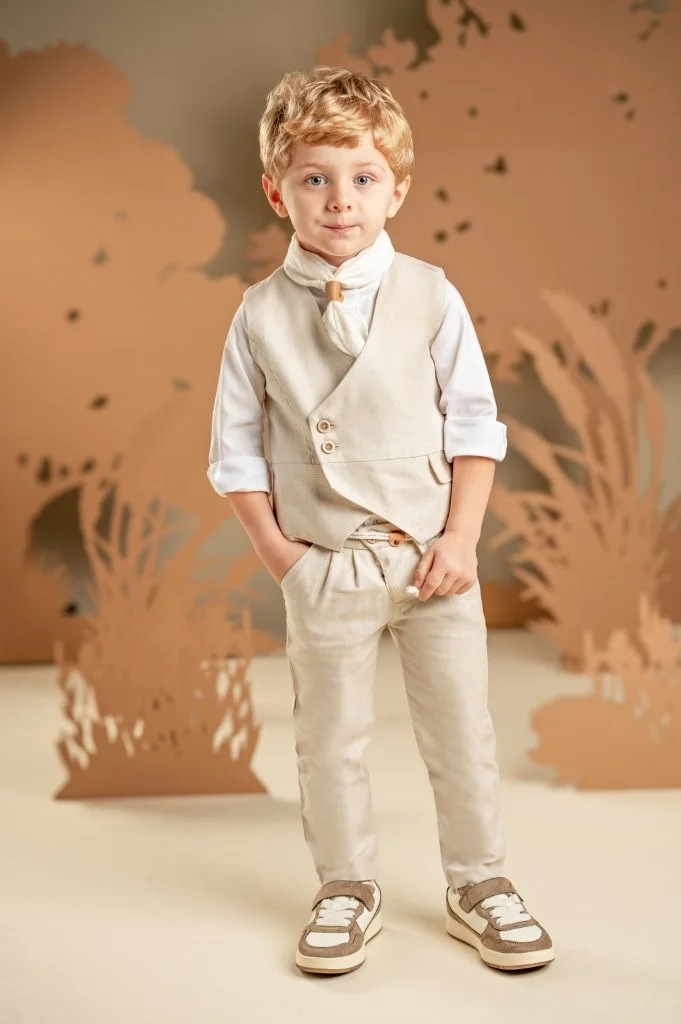 Για τους μικρούς κυρίους που αγαπούν το στυλ και τη λεπτομέρεια, αυτό το σετ υπόσχεται να εντυπωσιάσει σε κάθε ιδιαίτερη περίσταση. Το δίπιετο παντελόνι με το λοξό κούμπωμα συνδυάζεται τέλεια με το σταυρωτό γιλέκο και τα δύο από tencel-cotton-linen ύφασμα σε ανοιχτή μπεζ απόχρωση. Το off white βαμβακερό πουκάμισο με τον ιδιαίτερο Mao γιακά μαζί με το φουλάρι από τσαλακωμένο βουάλ σε λευκό χρώμα συμπληρώνουν ιδανικά το look. Για το τελικό στυλ μπορείτε να επιλέξετε ανάμεσα στο ψάθινο καπέλο ή την υφασμάτινη τραγιάσκα, ανάλογα με την προτίμησή σας.