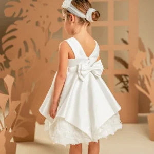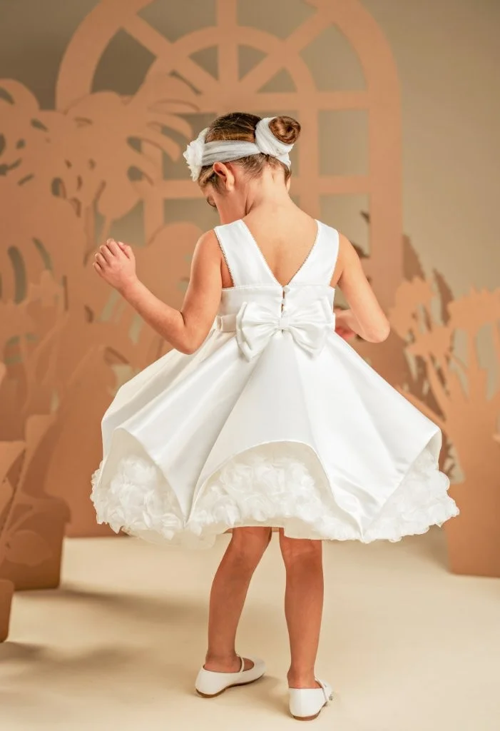 Ένα φόρεμα που συνδυάζει την καθαρότητα της γραμμής με την ποιητική ρομαντική διάθεση σε off white απόχρωση, φτιαγμένο εξολοκλήρου από σατέν ντουσέζ ύφασμα που χαρίζει διακριτική λάμψη. Το μπούστο μπροστά είναι λιτό και αυστηρά καθαρό στις γραμμές ενώ η πλάτη κλέβει διακριτικά την παράσταση με εντυπωσιακές φαρδιές τιράντες, προσθέτοντας σύγχρονη αισθητική στο σχέδιο. Η φούστα ομπρέλα με ασύμμετρες μύτες κινείται με χάρη σε κάθε βήμα, ενώ στο τελείωμά της «ανθίζουν» υφασμάτινα τριαντάφυλλα, μία ρομαντική πινελιά που ισορροπεί ιδανικά με τη λιτότητα του υπόλοιπου σχεδίου. Το σύνολο ολοκληρώνεται με κορδέλα μαλλιών διακοσμημένη με υφασμάτινα αλπικέ τριαντάφυλλά ίδια με του φορέματος, δημιουργώντας μια απόλυτα αρμονική εικόνα.