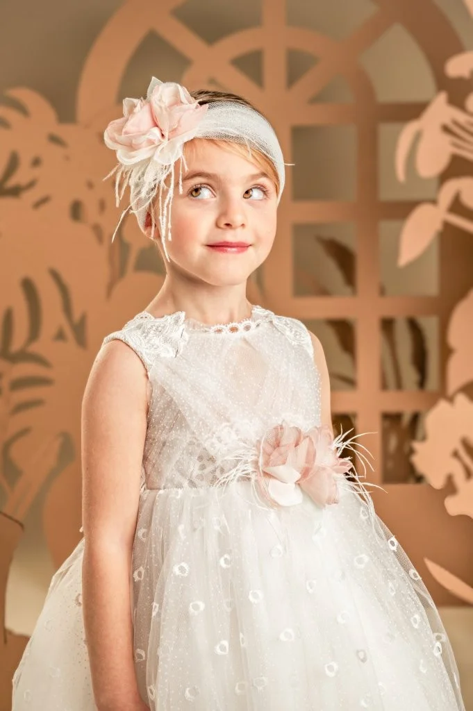 Ένα εξαιρετικό φόρεμα σε off white χρώμα, με εκπληκτικό σχέδιο και μοναδικό συνδυασμό υφασμάτων. Το μπούστο μπροστά αποτελείται από πουά τούλι περίτεχνα ντραπαριστό και δαντέλες που παίζουν με τις διαφάνειες, ενώ στο πίσω μέρος μια πανέμορφη δαντέλα αγκαλιάζει μέρος της πλάτης και των ώμων. Η φούστα με πλούσια σούρα από κεντημένο τούλι ολοκληρώνει όμορφα το μπούστο μαζί με τα χρωματιστά χειροποίητα λουλούδια που δίνουν μια πινελιά χρώματος στο ρούχο. Η κορδέλα για τα μαλλιά, στολισμένη και αυτή με τα ίδια λουλούδια του μπούστου ολοκληρώνουν τέλεια το σύνολο.