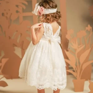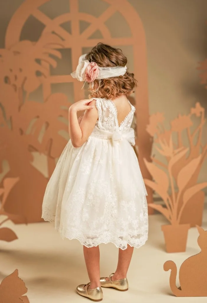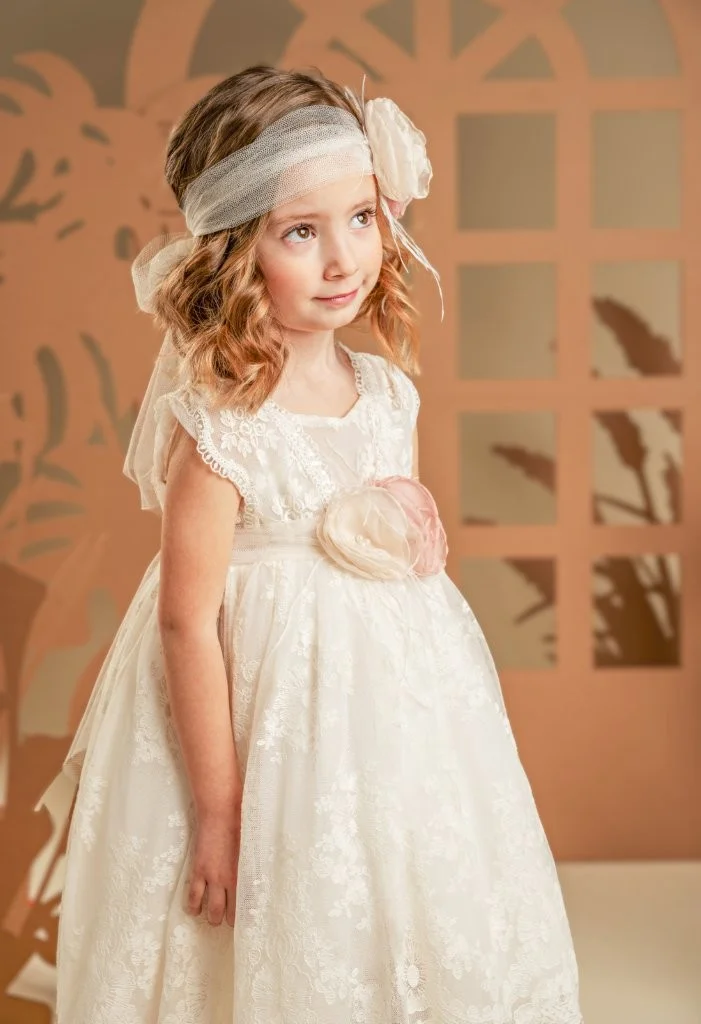 Ένα φόρεμα που αποπνέει νοσταλγική διάθεση, φτιαγμένο εξολοκλήρου από μοναδική δαντέλα σε ιβουάρ απόχρωση. Ξεχωρίζει για τις ντραπέ τιράντες από δαντέλα στο μπούστο, την υπέροχα ανοιχτή πλάτη και την πλούσια, σουρωτή φούστα. Η τούλινη ζώνη στη μέση προσφέρει τέλεια εφαρμογή και στολίζεται με δύο υπέροχα λουλούδια σε παστέλ αποχρώσεις του ροζ και του ιβουάρ. Την εμφάνιση ολοκληρώνει η τούλινη κορδέλα για τα μαλλιά, διακοσμημένη με τα ίδια χειροποίητα λουλούδια του φορέματος.