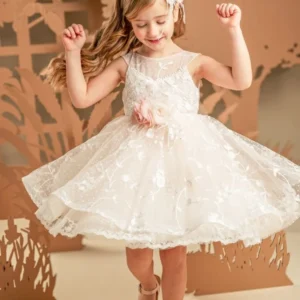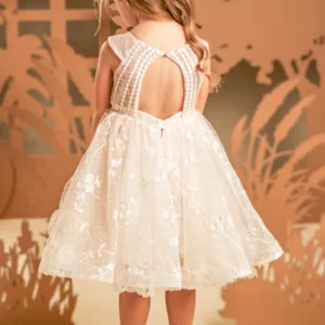 Ένα πανέμορφο ρομαντικό φόρεμα από κεντημένο πουά τούλι σε απαλή απόχρωση πούδρας. Το μπούστο έχει πλισσαριστό ντραπέ, διαφάνεια και εντυπωσιακή διάφανη πλάτη, διακοσμημένη με λεπτές στρώσεις δαντέλας. Η πλούσια κυματιστή φούστα-ομπρέλα, φτιαγμένη από το ίδιο ύφασμα, στολίζεται υπέροχα με χρωματιστά χειροποίητα λουλούδια, ίδια με αυτά που στολίζουν την τούλινη κορδέλα για τα μαλλιά.