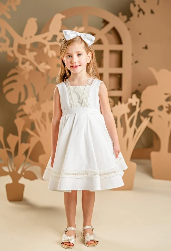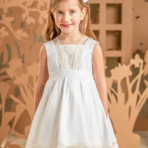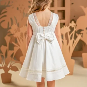 Ένα μοναδικό φόρεμα σε off white χρώμα, φτιαγμένο από υψηλής ποιότητας λινό-βαμβάκι, που αποπνέει κομψότητα και πολυτελή απλότητα. Το μπούστο στολίζεται με μια υπέροχη μακραμέ δαντέλα που συνεχίζει μέχρι την πλάτη και δημιουργεί ένα όμορφο σχέδιο. Η φούστα ομπρέλα με τις πιέτες χαρίζει όγκο αλλά και κίνηση ενώ στολίζεται και αυτή με την ίδια δαντέλα του μπούστου. Το φόρεμα ολοκληρώνεται με μια ζώνη στη μέση που καταλήγει πίσω σε διπλό φιόγκο και μια τούλινη κορδέλα για τα μαλλιά με εντυπωσιακό μεγάλο φιόγκο.
