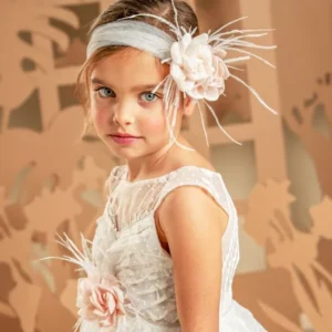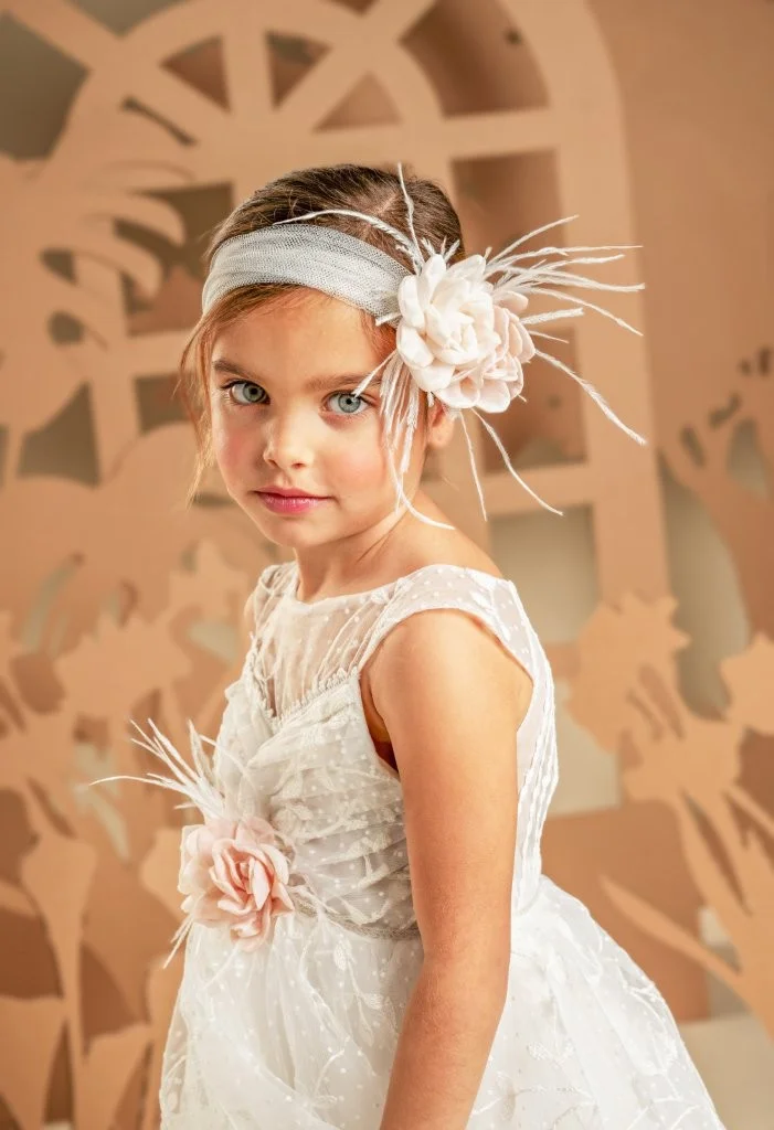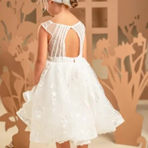 Ένα πανέμορφο ρομαντικό φόρεμα από κεντημένο πουά τούλι σε off white χρώμα. Το μπούστο έχει πλισσαριστό ντραπέ, διαφάνεια και εντυπωσιακή διάφανη πλάτη, διακοσμημένη με λεπτές στρώσεις δαντέλας. Η πλούσια κυματιστή φούστα-ομπρέλα, φτιαγμένη από το ίδιο ύφασμα, στολίζεται υπέροχα με χρωματιστά χειροποίητα λουλούδια, ίδια με αυτά που στολίζουν την τούλινη κορδέλα για τα μαλλιά.