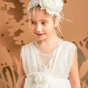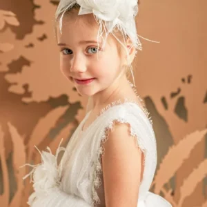 Ένα πανέμορφο και αιθέριο φόρεμα φτιαγμένο από πουά τούλι σε off white χρώμα. Το μπούστο έχει πλούσιο ντραπέ και στολίζεται με γαλλική δαντέλα, ενώ η φούστα με τις πολλαπλές στρώσεις από τούλι καταλήγει πίσω σε μια εκπληκτική αποσπώμενη ουρά τριών επιπέδων. Το σύνολο ολοκληρώνεται με το χειροποίητο λουλούδι στο στήθος και την τούλινη κορδέλα για τα μαλλιά, διακοσμημένη και αυτή με ένα μεγάλο λουλούδι και φτερά, ολοκληρώνοντας άψογα το look.