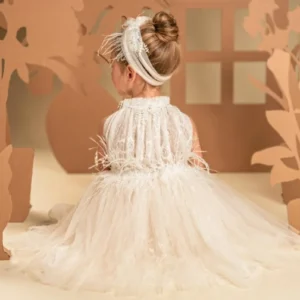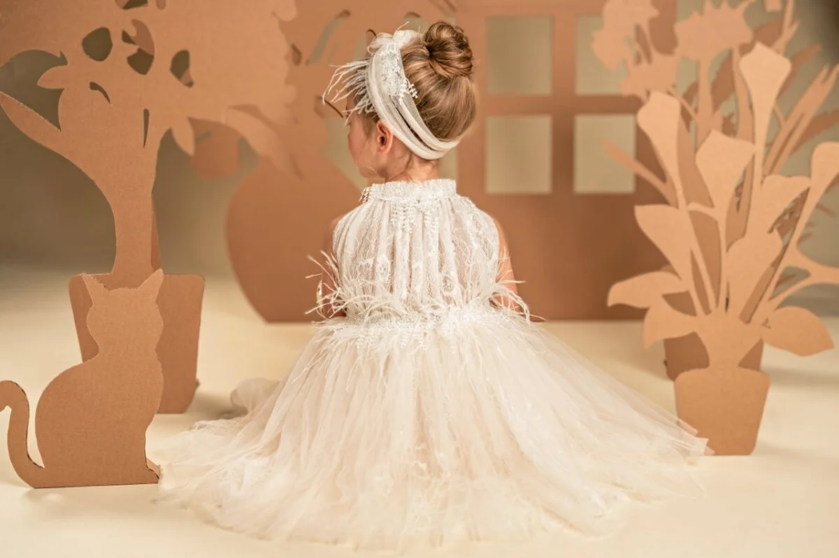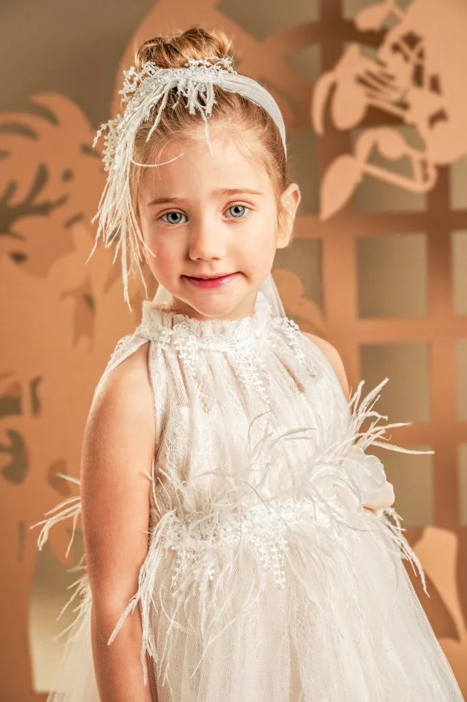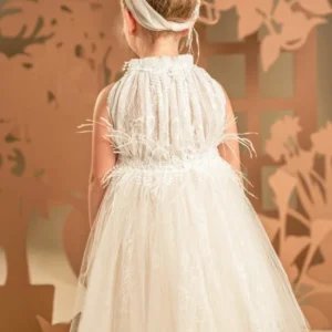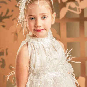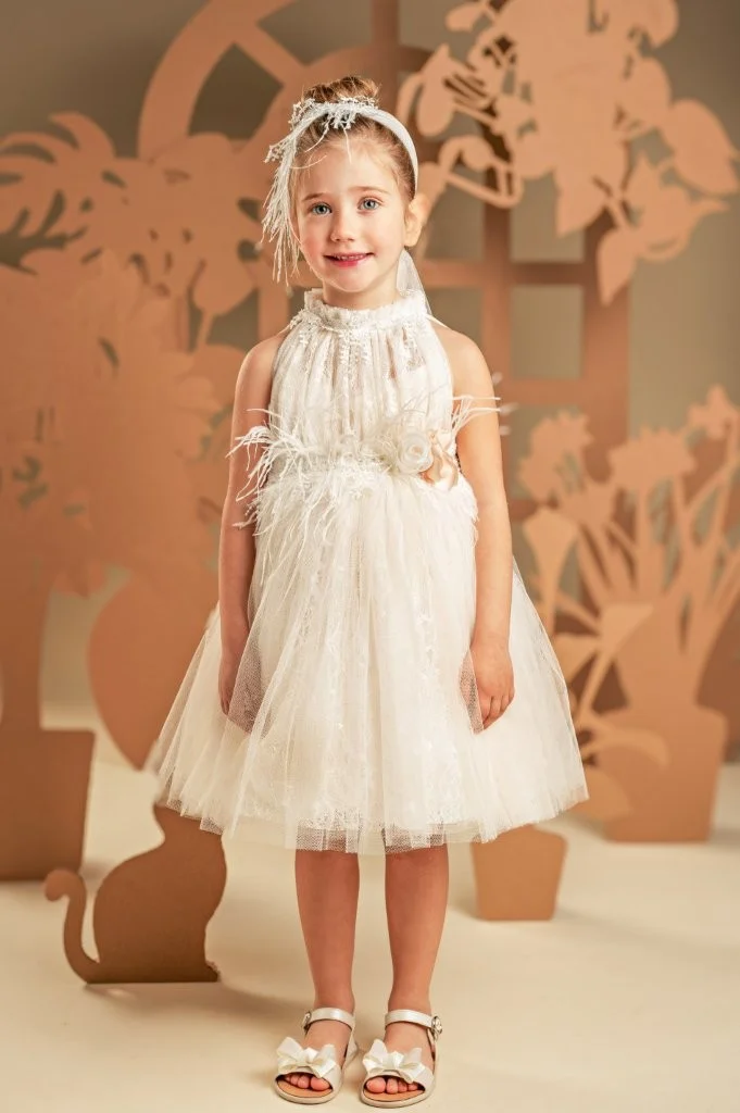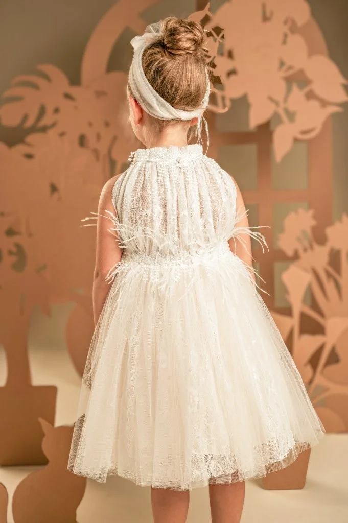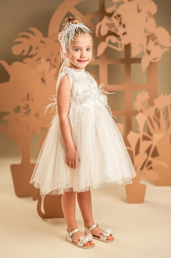 Ένα υπέροχο ρομαντικό φόρεμα σε απαλή απόχρωση της πούδρας, φτιαγμένο από ραφινάτη γαλλική δαντέλα και μαλακό τούλι. Το ντραπαριστό και πλούσιο μπούστο, με σούρες στη λαιμόκοψη αναδεικνύει τη μοναδικότητα του σχεδίου, ενώ οι αποκαλυπτικοί ώμοι προσδίδουν μια αίσθηση κομψότητας. Η φούστα με πλούσιες σούρες, στολίζεται υπέροχα στη μέση με μια διακοσμητική, απλικέ φλοράλ τρέσα και φτερά στρουθοκαμήλου. Το σύνολο ολοκληρώνεται με κορδέλα για τα μαλλιά, διακοσμημένη με φιόγκο, φτερά και λουλούδια.