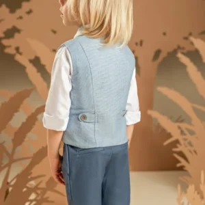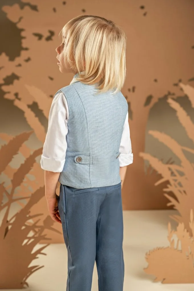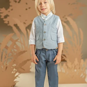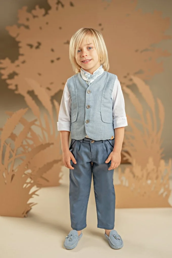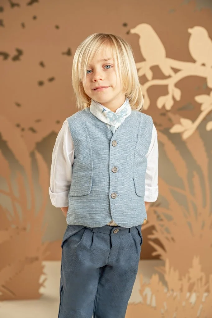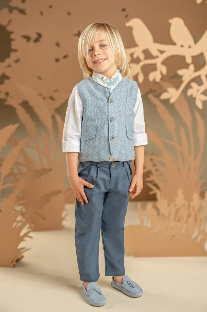 Μια διαχρονική πρόταση με μοντέρνες λεπτομέρειες για τους μικρούς μας κυρίους. Παντελόνι από μπλε βαμβακερό καμβά και γιλέκο από μελανζέ βαμβακερό σιελ ύφασμα σε κλασική γραμμή, το οποίο ξεχωρίζει για τα έξυπνα κοψίματα που καταλήγουν σε τσέπες, Το λευκό βαμβακερό πουκάμισο με Mao γιακά και το φουλάρι σε σιελ αποχρώσεις με exclusive τύπωμα Baby Bloom ολοκληρώνουν ιδανικά το σύνολο. Για την τελική πινελιά, επιλέξτε ανάμεσα σε ψάθινο καπέλο ή υφασμάτινη τραγιάσκα, ανάλογα με το προσωπικό σας στυλ.