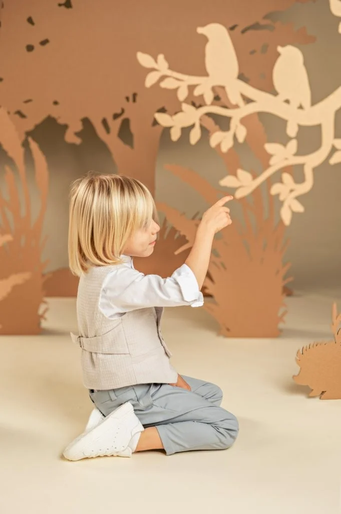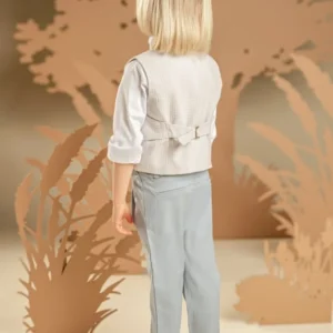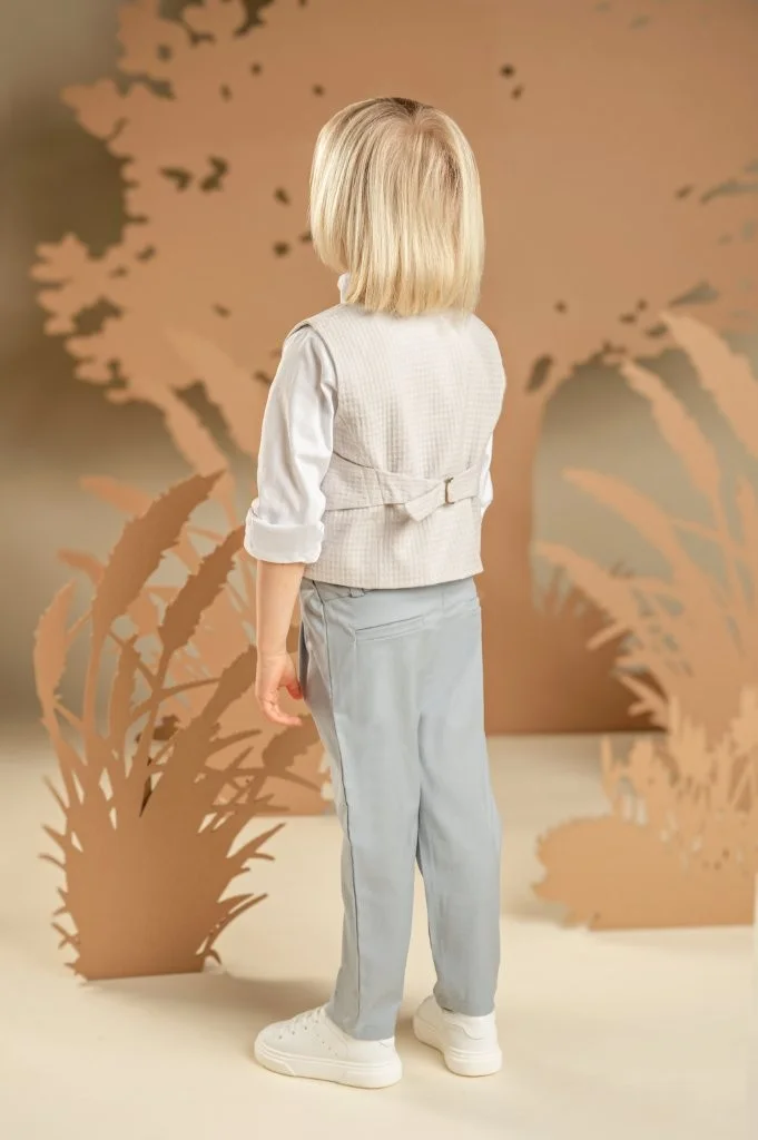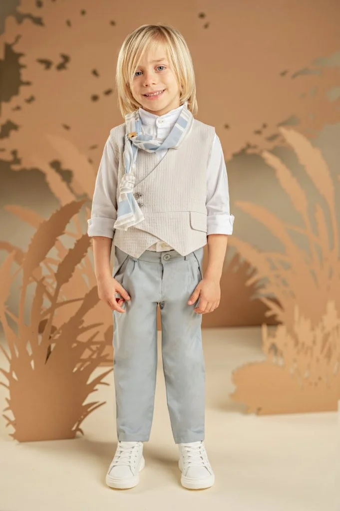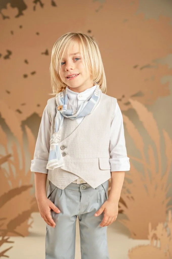 Ένα μοναδικό αγορίστικο σύνολο με προσεγμένες λεπτομέρειες που αναδεικνύουν την υψηλή ποιότητα και τη σύγχρονη αισθητική του. Το σιελ-γκρι δίπιετο παντελόνι από tencel-linen ύφασμα συνδυάζεται εξαιρετικά με το σταυρωτό βαμβακερό γιλέκο από πικέ ύφασμα με ιδιαίτερη πλέξη σε ανοιχτό γκρι. Το off white βαμβακερό πουκάμισο με τον ιδιαίτερο Mao γιακά χαρίζει φρεσκάδα και κομψότητα στο look. Την εμφάνιση ολοκληρώνουν το μακρόστενο φουλάρι από βουάλ εμπριμέ με γεωμετρικά σχέδια baby bloom exclusive σε μπλε-σιελ αποχρώσεις και ανάλογα με το στιλ που προτιμάτε διαλέξτε ανάμεσα στο ψάθινο καπέλο ή την υφασμάτινη τραγιάσκα.