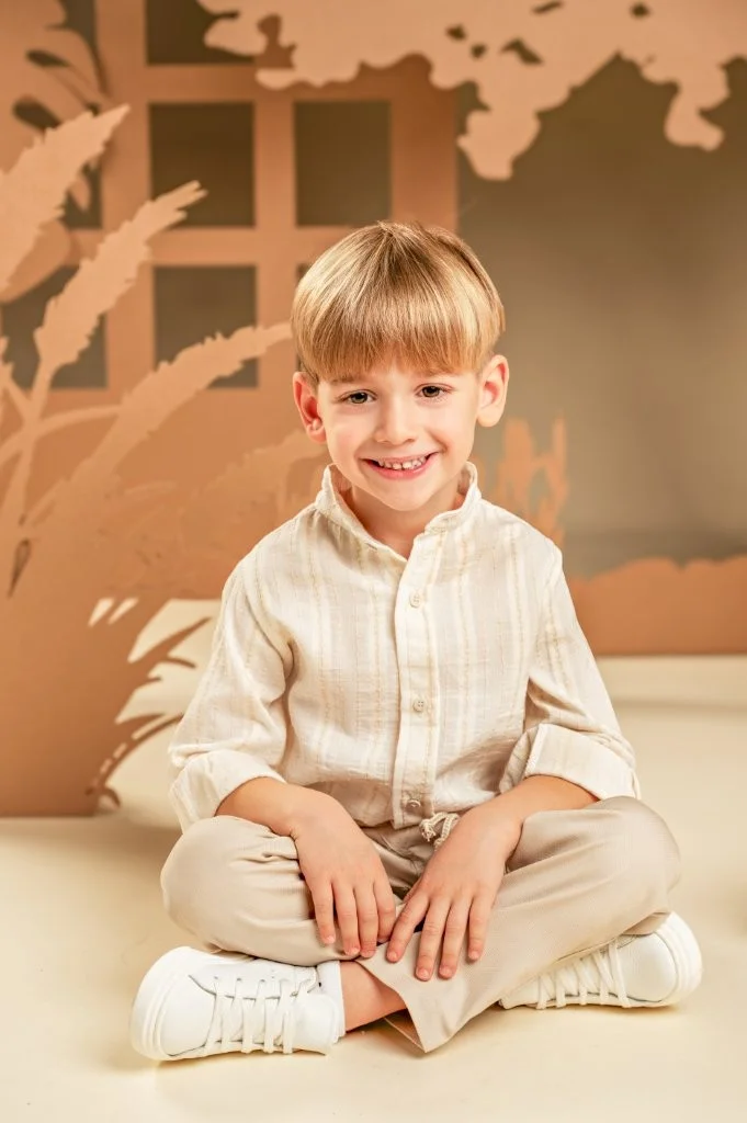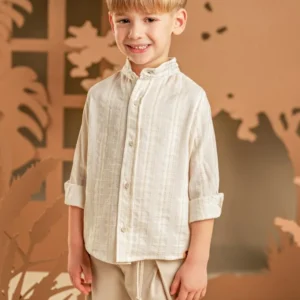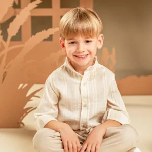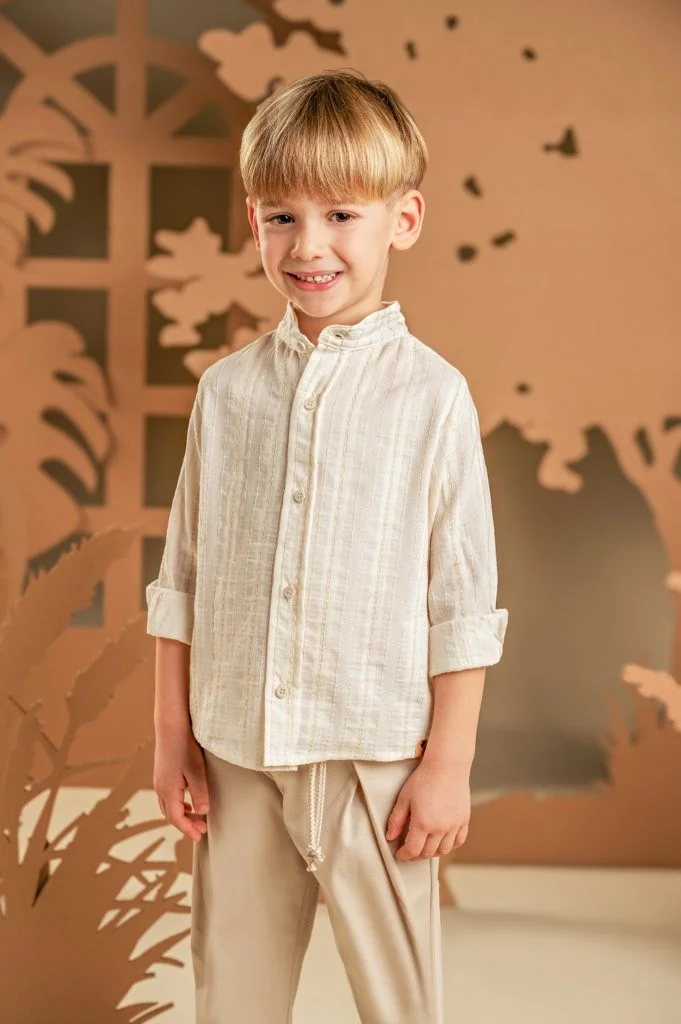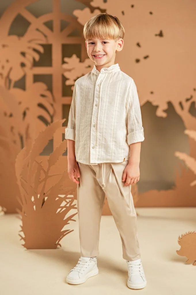 Ένα χαλαρό και casual look για αυτούς που προτιμάνε μια καλοκαιρινή εμφάνιση.  Το σετ αποτελείται από παντελόνι βαμβακερό σε μπεζ χρώμα και πουκάμισο σε εκρού-μπεζ  υφαντό ύφασμα με Μάο γιακά. Το σύνολο ολοκληρώνεται με το εμπριμέ φλοράλ φουλάρι Baby Bloom exclusive σε σαφράν-μέντα χρώμα και ανάλογα με το στιλ που προτιμάτε, ψάθινο καπέλο ή υφασμάτινη  τραγιάσκα .