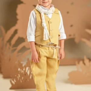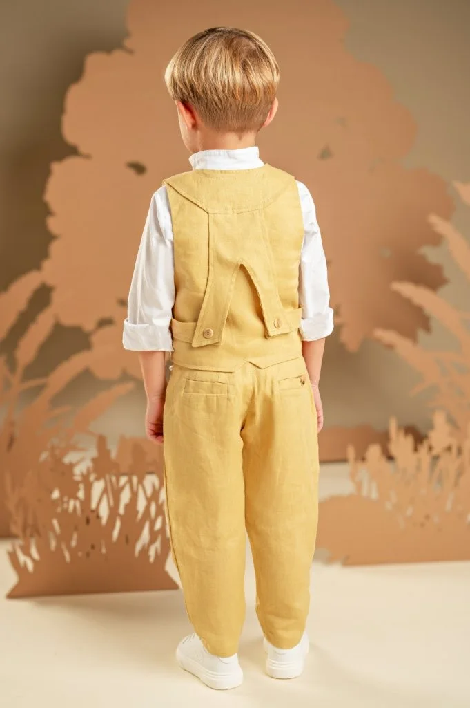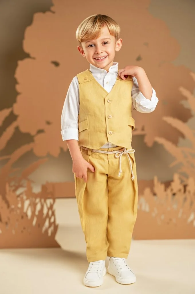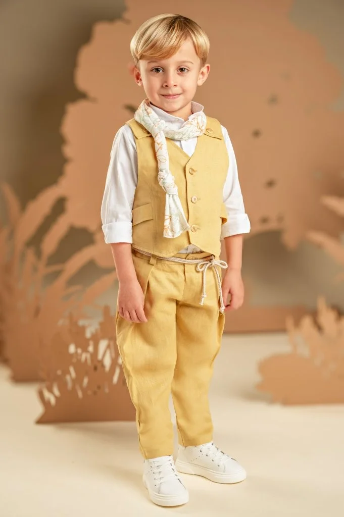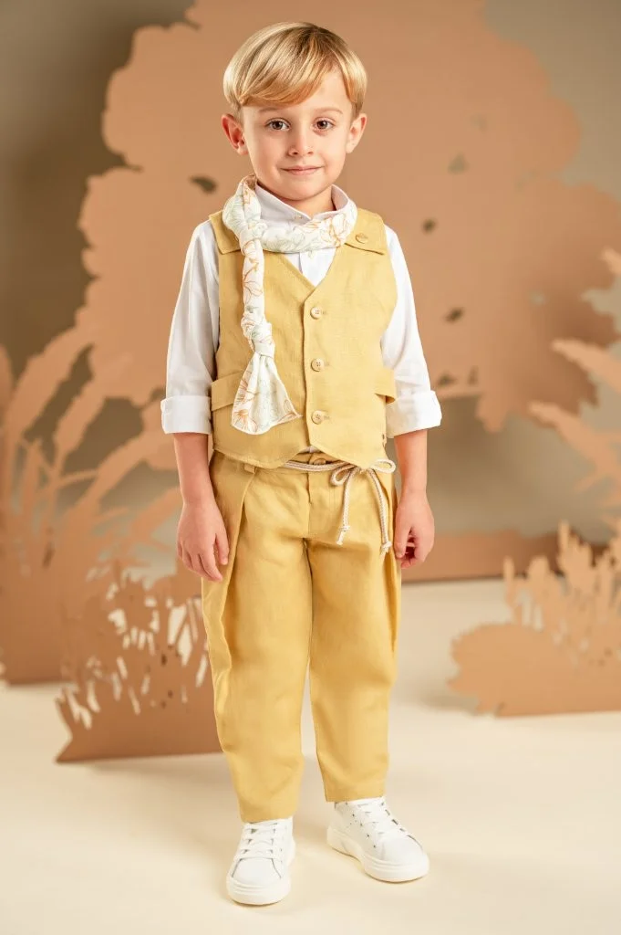 Ένα σύνολο με σύγχρονο χαρακτήρα και καλοκαιρινό χρώμα, ιδανικό για ξεχωριστές εμφανίσεις. Το παντελόνι σε yellow ginger απόχρωση, φτιαγμένο από λινό ύφασμα, συνδυάζεται άψογα με το γιλέκο στο ίδιο ύφασμα και χρώμα, που εντυπωσιάζει με την ιδιαίτερη πλάτη του. Το λευκό βαμβακερό πουκάμισο φωτίζει το σύνολο ενώ το φλοράλ φουλάρι σε αποχρώσεις μέντα και σαφράν με exclusive τύπωμα Baby Bloom ολοκληρώνει το look με μοντέρνα πινελιά. Για το τελικό στυλ, επιλέξτε ανάμεσα σε ψάθινο καπέλο ή υφασμάτινη τραγιάσκα, ανάλογα με το προσωπικό σας γούστο.
