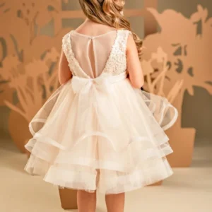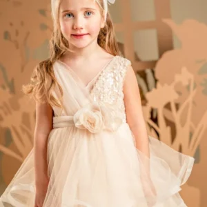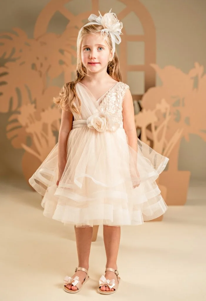 Ένα φόρεμα βγαλμένο από παραμύθι για σύγχρονες πριγκίπισσές, στις γλυκές αποχρώσεις της apricot cream. Το εντυπωσιακό κρουαζέ μπούστο είναι φτιαγμένο από ντραπαριστό τούλι και παγιέτες, ενώ η αέρινη και εκθαμβωτική φούστα δημιουργείται από πολλαπλές στρώσεις τούλι με πλούσιους κυματισμούς που χορεύουν σε κάθε κίνηση. Την εμφάνιση ολοκληρώνει τέλεια η τούλινη ζώνη με τα πανέμορφα χειροποίητα λουλούδια και η κορδέλα για τα μαλλιά, στολισμένη με τα ίδια λουλούδια του ρούχου.