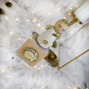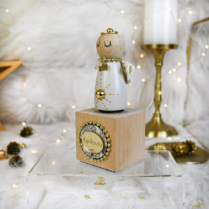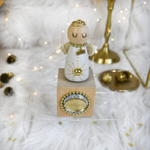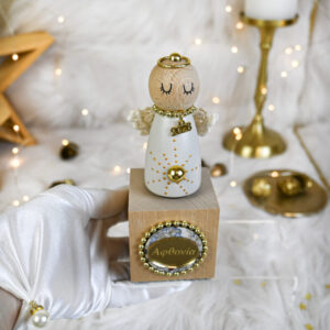 Υλικά: Χειροποίητο αγγελάκι από ξύλο οξιάς, φτιαγμένο σε ξυλότορνο, σε εκρού χρώμα, πάνω σε κυβική ξύλινη βάση φυσικής απόχρωσης. Το αγγελάκι διακοσμείται με χρυσές λεπτομέρειες και χρυσή πέρλα που σχηματίζουν αστεράκι, χρυσή διακοσμητική πολυεστερική τρέσα, χρυσό μεταλλικό κρίκο για φωτοστέφανο με πέρλα και εκρού πλεκτή δαντέλα για φτερά. Η βάση του κοσμείται με plexiglass gold στρογγυλό στοιχείο με χάραξη “Αφθονία”, ξύλινο στρογγυλό στοιχείο με print, χρυσή διακοσμητική πολυεστερική τρέσα και εκκρεμές χρυσό μεταλλικό μοτίφ ’2026.
