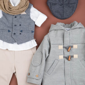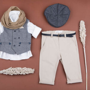 Ο Klearxos είναι ένα βαπτιστικό κοστούμι που έχετε αγαπήσει πολύ. Ο συνδυασμός μπεζ παντελονιού, λευκού πουκαμίσου και μπλε ιδιαίτερου γιλέκου θα σας εκπλήξει. Το πλεκτό φουλάρι σε μπεζ καφέ αποχρώσεις και η μπλε δερμάτινη ζώνη ταιριάζουν απόλυτα και ολοκληρώνουν το σύνολο.