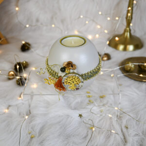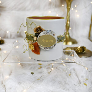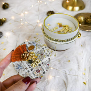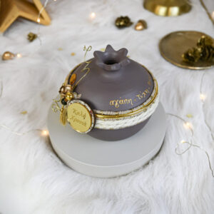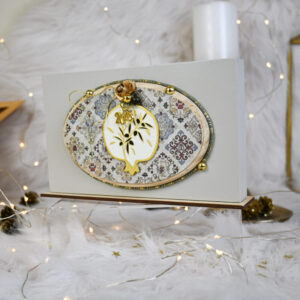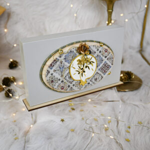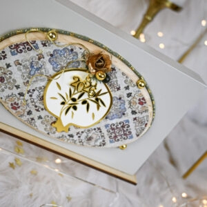 Υλικά: Ξύλινη μασίφ ορθογώνια πλακέτα σε εκρού απόχρωση, πάνω σε λεπτή ξύλινη βάση φυσικής απόχρωσης. Διακοσμείται με ξύλινο στοιχείο σουηδικής προέλευσης πάχους 1 cm με ειδική λείανση με print, χρυσό μεταλλικό στοιχείο ρόδιπράσινο-χρυσό κορδόνι, διακοσμητικό συρματάκι σε χρυσό χρώμα, τεχνητό λουλούδι, πολυεστερικές και ξύλινες χάντρες υψηλής ποιότητας και εκκρεμές χρυσό μεταλλικό μοτίφ ’2026.