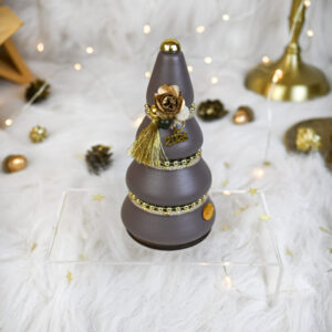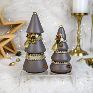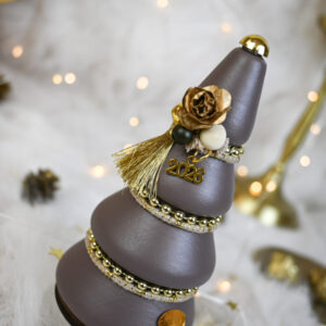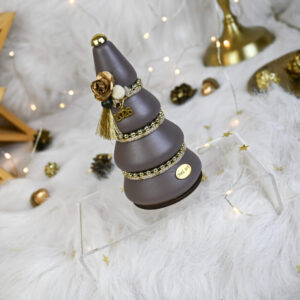 Υλικά: Χειροποίητο δεντράκι από ξύλο οξιάς, φτιαγμένο σε ξυλότορνο, σε καφέ χρώμα, πάνω σε λεπτή ξύλινη βάση φυσικής απόχρωσης. Διακοσμείται περιμετρικά με χρυσή διακοσμητική πολυεστερική τρέσα, εκρού-χρυσό κορδόνι, τεχνητά λουλούδια, πέρλα στην κορυφή του, πολυεστερικές χάντρες υψηλής ποιότητας, διακοσμητική φούντα σε χρυσό χρώμα και εκκρεμές χρυσό μεταλλικό μοτίφ ’2026.