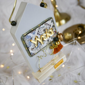 Υλικά: Ξύλινο μασίφ σπιτάκι σε εκρού χρώμα, πάνω σε ξύλινη βάση με επίπεδα φυσικής απόχρωσης. Η μπροστινή του πλευρά διακοσμείται με παραλληλόγραμμο στοιχείο με print, εκκρεμές χρυσό μεταλλικό μοτίφ ’26, τεχνητά λουλούδια, πορτοκαλί διακοσμητική φούντα, πράσινο-χρυσό κορδόνι, μεταλλικό διακοσμητικό συρματάκι, πολυεστερικές και ξύλινες χάντρες υψηλής ποιότητας. Στην οροφή του έχει μεταλλικό διακοσμητικό συρματάκι και διακοσμητικό στοιχείο καμπάνα.
