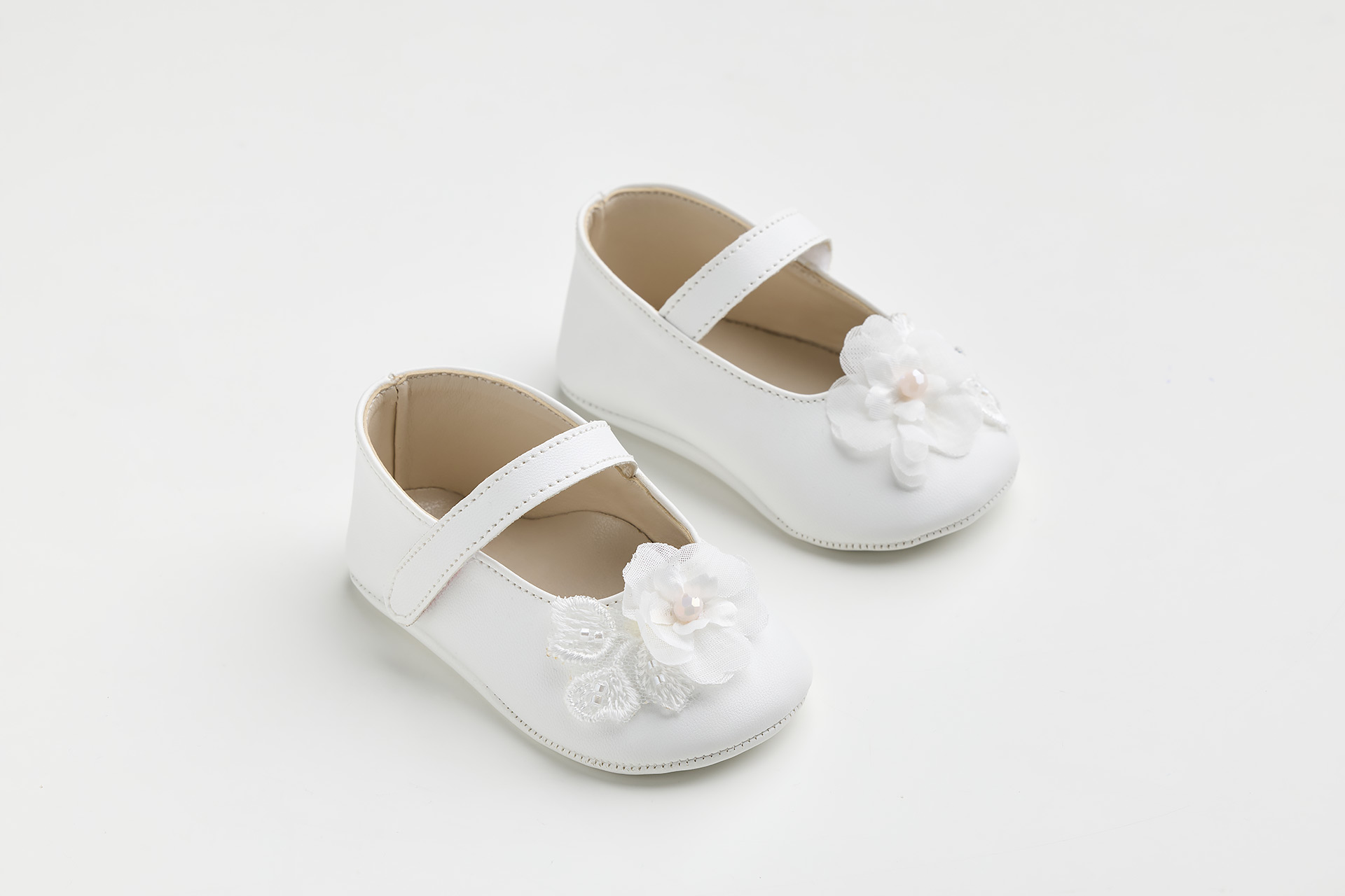 Μπαλαρίνα αγκαλιάς σε λευκό τεχνόδερμα με χειροποίητο διακοσμητικό λουλούδι. Με ρομαντική διάθεση το συγκεκριμένο παπουτσάκι αγκαλιάς. Η επιλογή που πάντα κερδίζει.