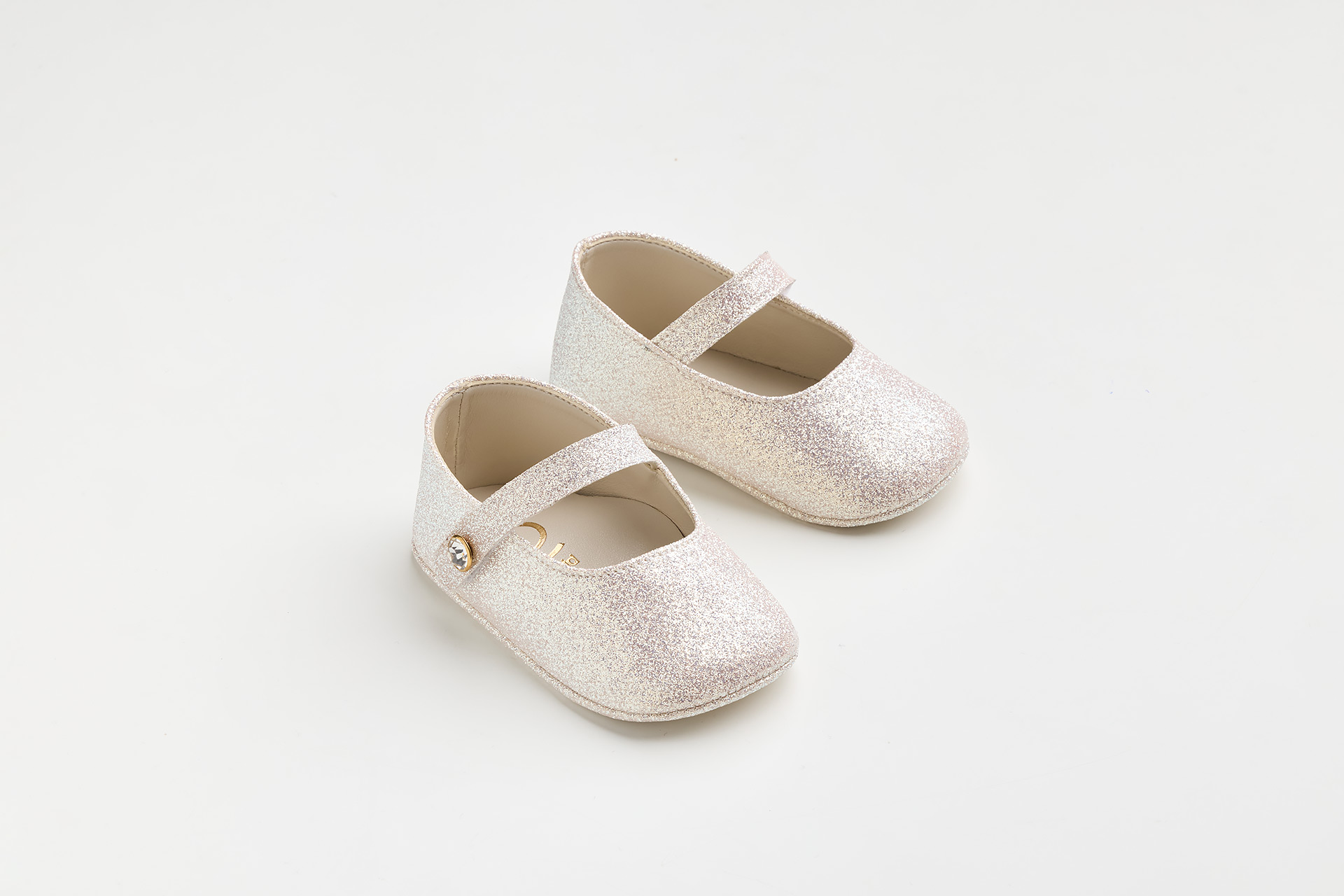 Μπαλαρίνα αγκαλιάς σε χρυσό γκλιτερ με διακοσμητικό στρας στην μπαρέτα. Ένα παπούτσι με λεπτοκομμένη λάμψη για όλες τις ξεχωριστές σας στιγμές. Στυλάτο με άποψη και άνεση για τις μικρές μας φίλες.