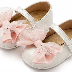 | Δερμάτινο Γοβακι Μονή Μπαρέτα με Χειροποίητο Υφασμάτινο Φιόγκο από Δέρμα Πέρλα σε Εκρού Ροζ Χρώμα |