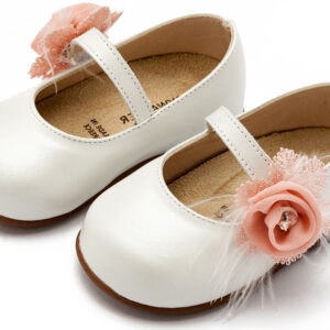 | Δερμάτινο Γοβακι Μονή Μπαρέτα με Χειροποίητο Λουλουδάκι με Πούπουλα από Δέρμα Πέρλα σε Εκρού Ροζ Χρώμα |
