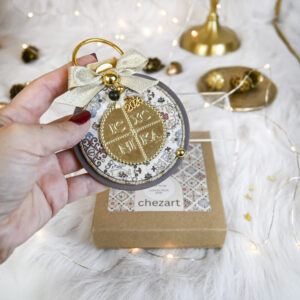 Υλικά: Ξύλινο στρογγυλό γούρι σε καφέ χρώμα. Διακοσμείται με ξύλινο στρογγυλό επίπεδο με print, εκρού-χρυσό κορδόνι, χρυσή διακοσμητική πολυεστερική τρέσα και στρογγυλό μεταλλικό στοιχείο κωνσταντινάτο. Στολίζεται με εκρού κορδέλα, πολυεστερικές και ξύλινες χάντρες, εκρού βελούδινη κορδέλα και εκκρεμές μεταλλικό μοτίφ ‘26.