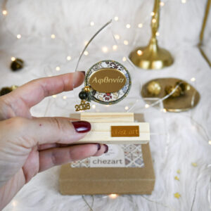 Υλικά: Επιτραπέζιο γούρι plexiglass διάφανο σε σχήμα σταγόνα, πάνω σε ξύλινη βάση φυσικής απόχρωσης. Διακοσμείται με ξύλινο στρογγυλό επίπεδο με print, plexiglass gold στοιχείο με μήνυμα “Αφθονία”, πράσινο-χρυσό κορδόνι, πολυεστερικές χάντρες και εκκρεμές χρυσό μεταλλικό ’26.