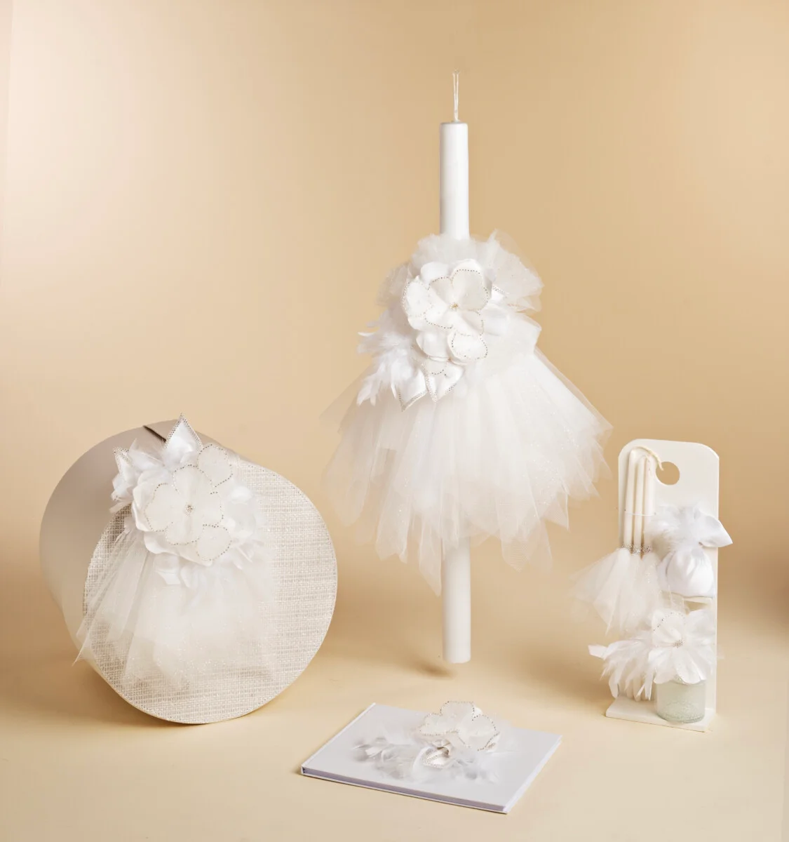 Τσάντα καπελιέρα από δερματίνη. Κύριο χαρακτηριστικό η γυαλιστερή ψάθα στο πάνω μέρος του κουτιού, σε συνδυασμό με το στολισμό από λευκά λουλούδια και τούλια. Λαμπάδα με λευκά τούλια πασπαλισμένα με ασημόσκονη. Τρισδιάστατες μαργαρίτες και πούπουλα μαραμπού συνθέτουν αυτή την elegant επιλογή . Στο σετ περιλαμβάνεται σετ λαδιού και ευχολόγιο ασορτί στολισμένα συμπληρώνοντας το πακέτο αυτό.
