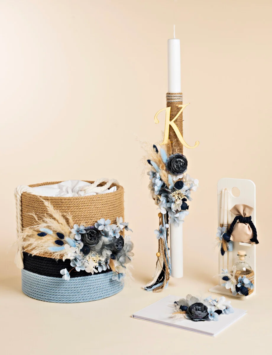 Υφασμάτινα λουλούδια, φυσικά pampas και κορδόνια σε μπλε σιέλ και σπαγγί χρωματισμούς, ξύλινο στρογγυλό καλάθι με πλούσια σύνθεση από λουλούδια. Ασορτί λαμπάδα με μεγάλο μονόγραμμα Plexiglass της επιλογής σας. Σέτ λαδιού σε ξύλινη βάση και βιβλίο ευχών ολοκληρώνουν το πακέτο αυτό.