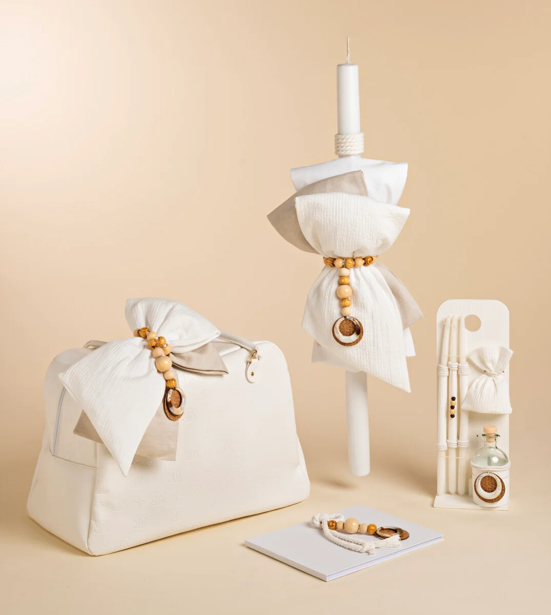Λευκή τσάντα από δερματίνη με υφασμάτινο φιόγκο σε λευκό-μπέζ και ξύλινες χάντρες, δίνει ένα πιο μποχο αποτέλεσμα. Λαμπάδα με πλούσια υφάσματα στις ίδιες αποχρώσεις, με ένα ξύλινο κολιέ στο δέσιμό της. Σετ λαδιού και ευχολόγιο ασορτί.