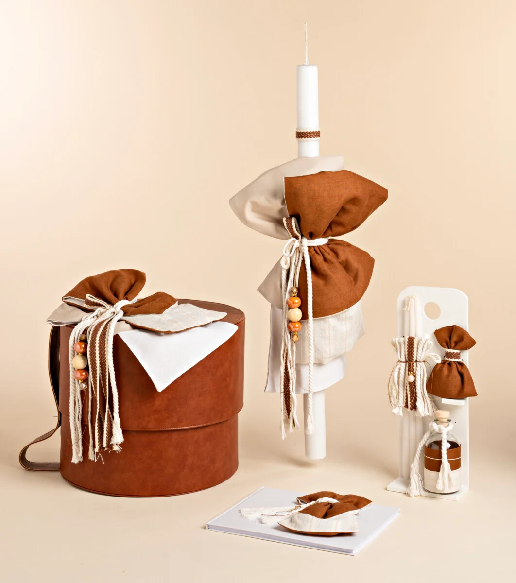 Ένα πακέτο σε αποχρώσεις του μπέζ και του σαφράν με υφάσματα, κορδόνια, ξύλινες χάντρες και βαμβακερούς ιμάντες, λαμπάδα, σέτ λαδιού και βιβλίο ευχών, στολισμένα αριστοκρατικά, για τις πιο γλυκές στιγμές.
