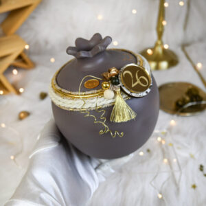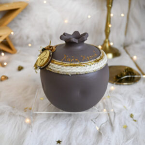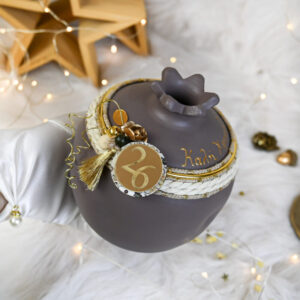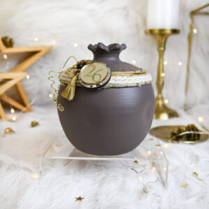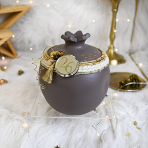 Υλικά: Διακοσμείται περιμετρικά με χρυσό μεταλλικό κρίκο, εκρού και εκρού-χρυσό κορδόνι, τεχνητά λουλούδια, χρυσό διακοσμητικό συρματάκι, χρυσή διακοσμητική φουντίτσα, πολυεστερικές και ξύλινες χάντρες υψηλής ποιότητας, ενώ αναγράφεται χειρόγραφα με ειδικό 3D περιγράμματος η φράση “Καλή Χρονιά”. Στη μπροστινή όψη διακοσμείται με ξύλινο στρογγυλό στοιχείο με print και plexiglass gold στρογγυλό στοιχείο με χάραξη “26”.