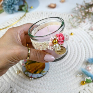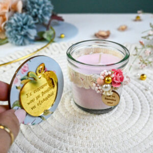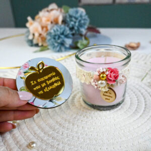 Χειροποίητο κερί σε γυάλινο βαζάκι με καπάκι σε υπέροχη παστέλ χρωματική σύνθεση και με ιδιαίτερη αφιέρωση.