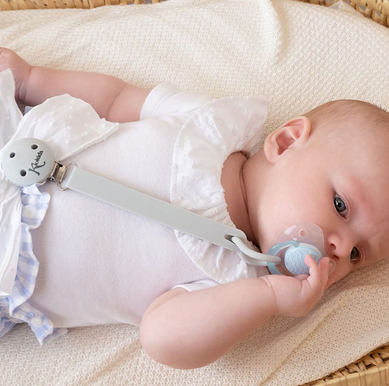 Kλιπ από ανοξείδωτο ατσάλι και σιλικόνη, ώστε να προσαρμόζονται σε κάθε πιπίλα με δαχτυλίδι. Με αυτόν τον τρόπο, οι πιπίλες δεν θα χαθούν ποτέ ούτε θα πέσουν στο πάτωμα.