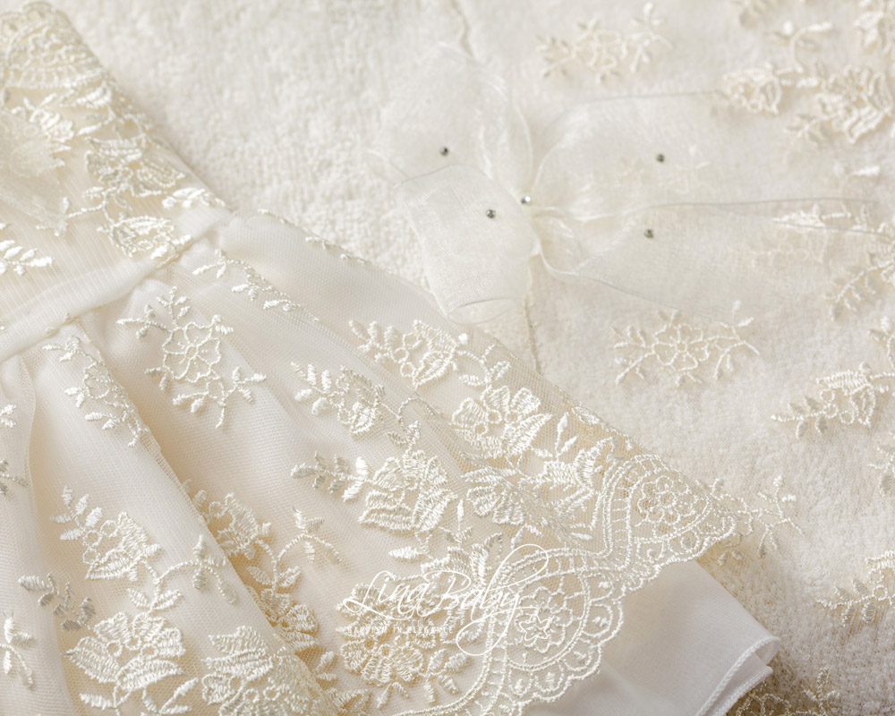 Λαδόπανα βάπτισης Lina Baby. Βαμβακερό σετ λαδόπανου σε δύο χρώματα λευκό και ιβουάρ με εντυπωσιακή Γαλλική Δαντέλα και φιόγκο από οργαντίνα με στρας τύπου swarovski.