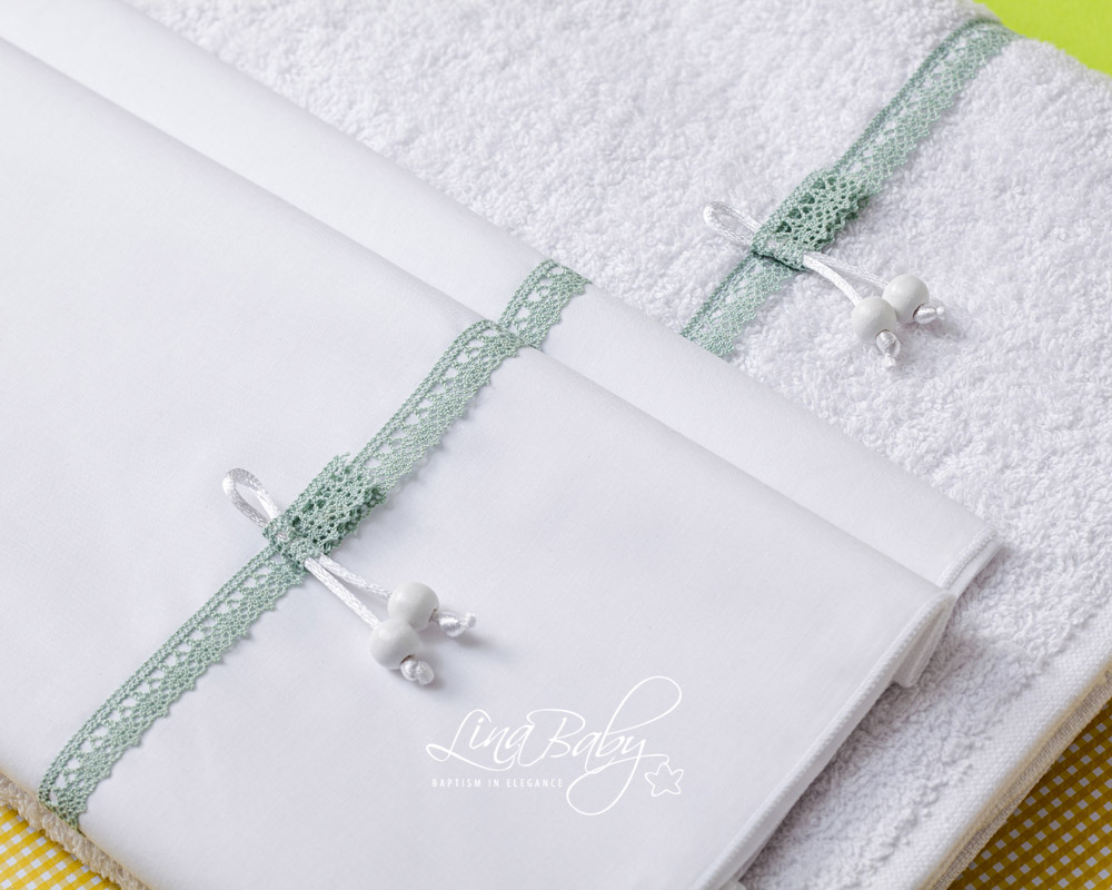 Βαμβακερό σετ λαδόπανου σε λευκό χρώμα με διακοσμητική τρέσα τύπου βελονάκι της γιαγιάς σε απόχρωση της μέντας και διακοσμητικές λευκές ξύλινες χάντρες.